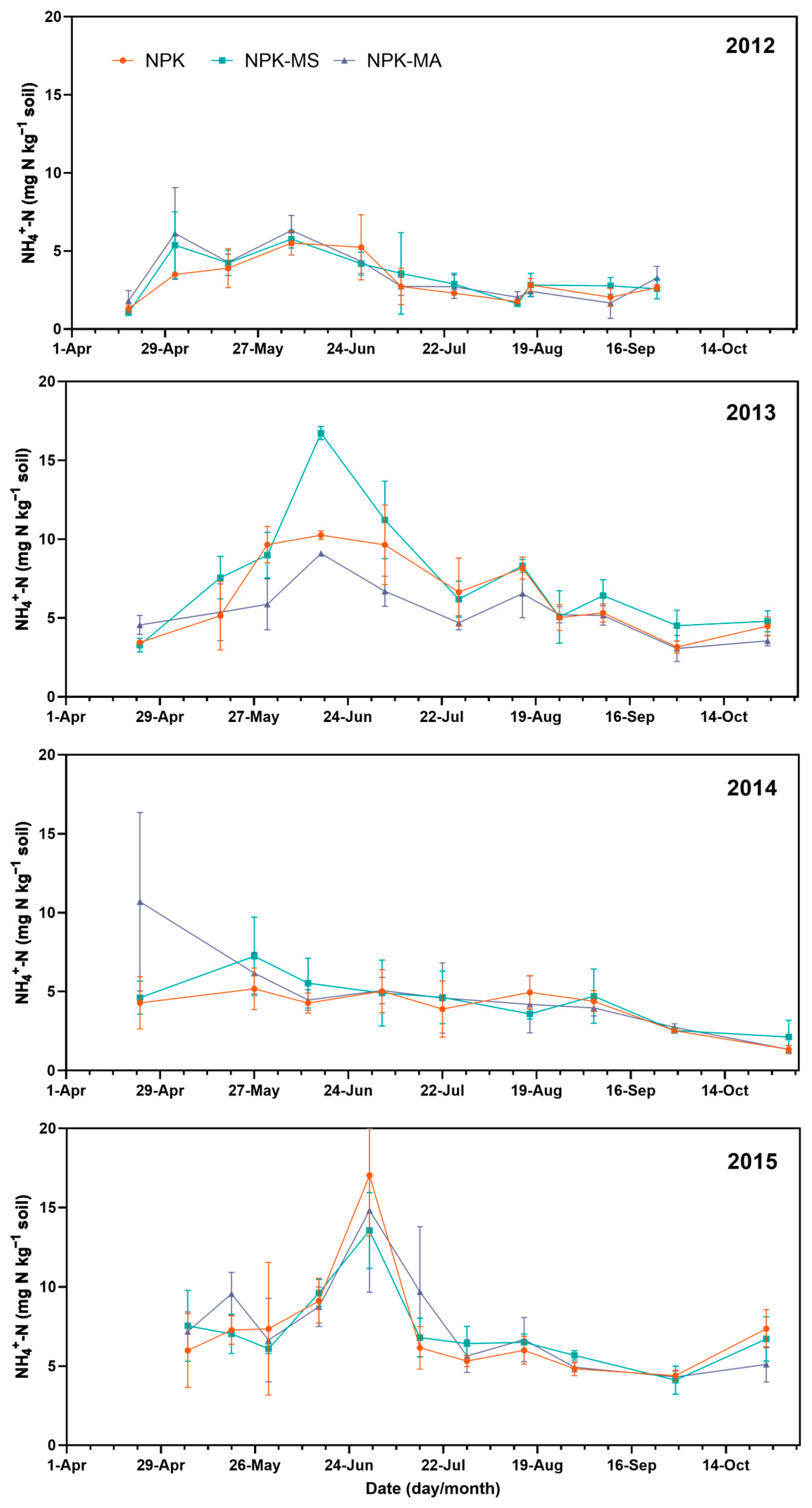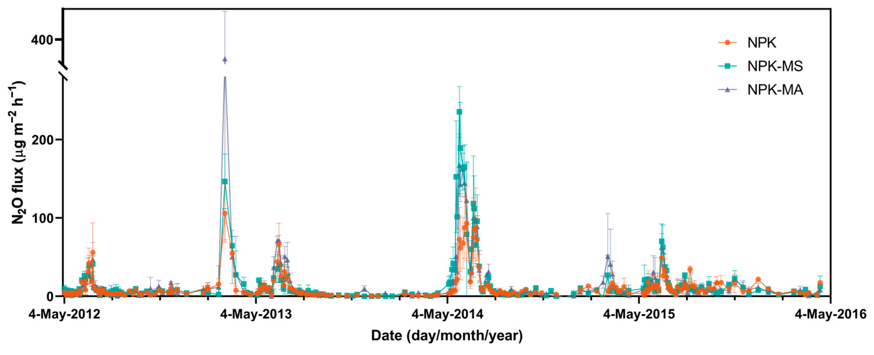 4.1. The Effect of Composted Manure Application Timing on N2O Emissions