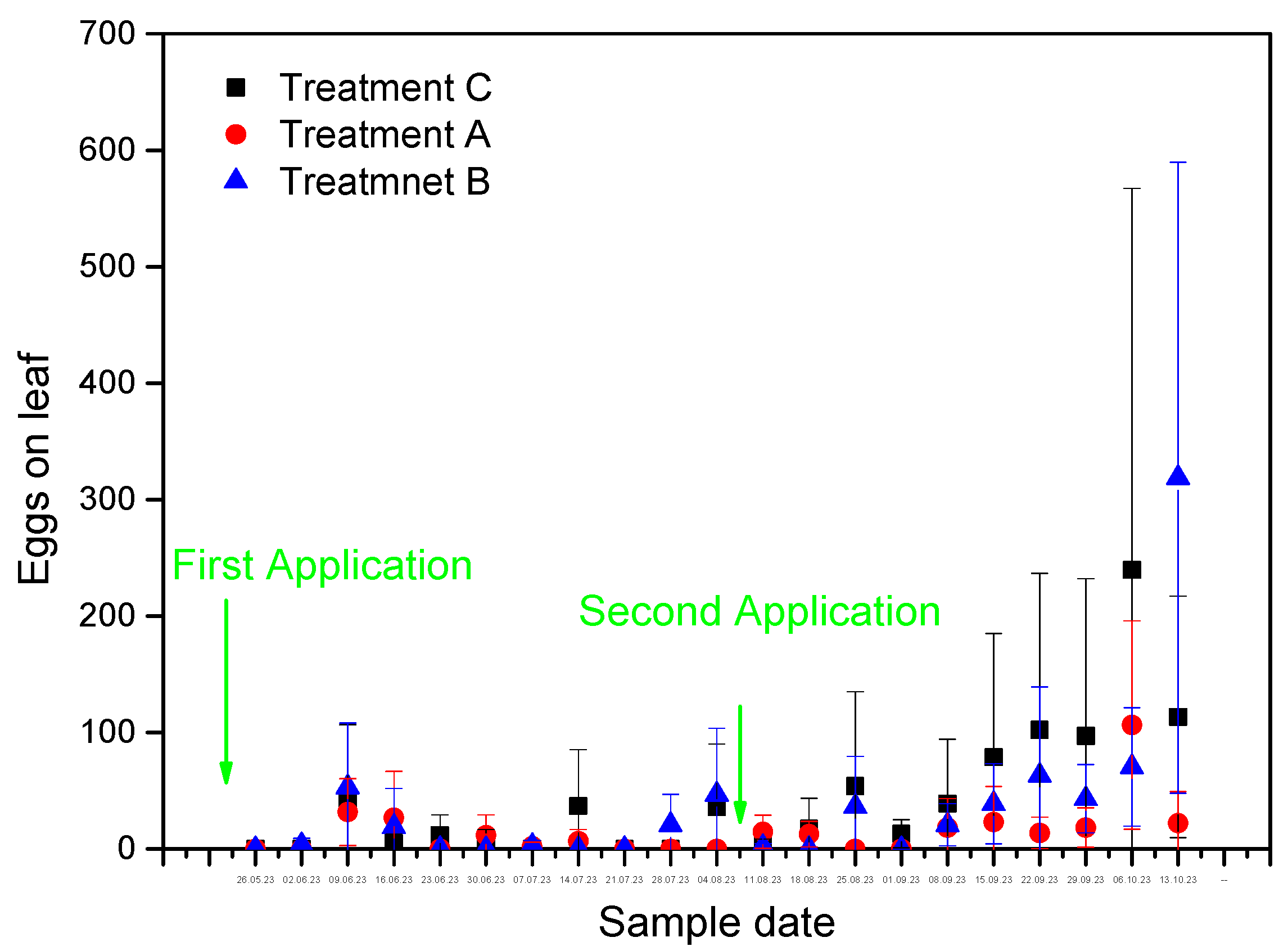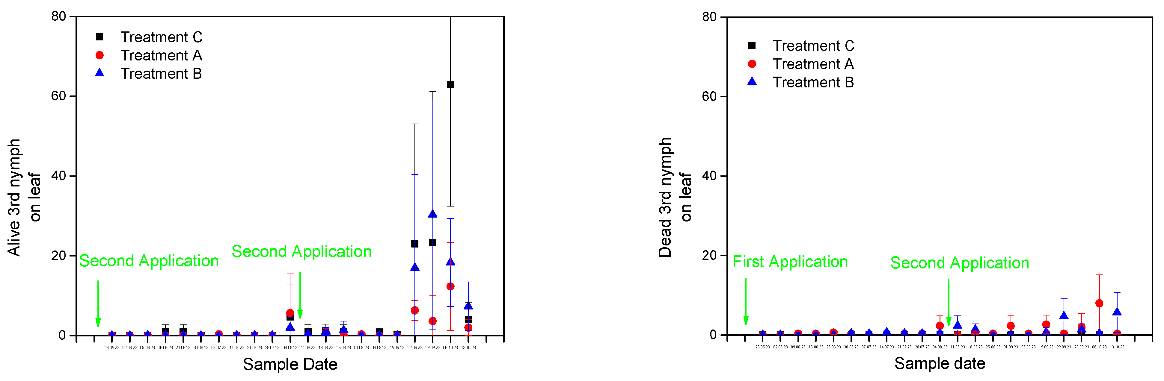 - Bohatá, A.; Folorunso, E.A.; Lencová, J.; Osborne, L.S.; Mraz, J. Control of Sweet Potato Whitefly (Bemisia tabaci) Using Entomopathogenic Fungi under Optimal and Suboptimal Relative Humidity Conditions. Pest Manag. Sci. 2024, 80, 1065–1075. [Google Scholar] [CrossRef]