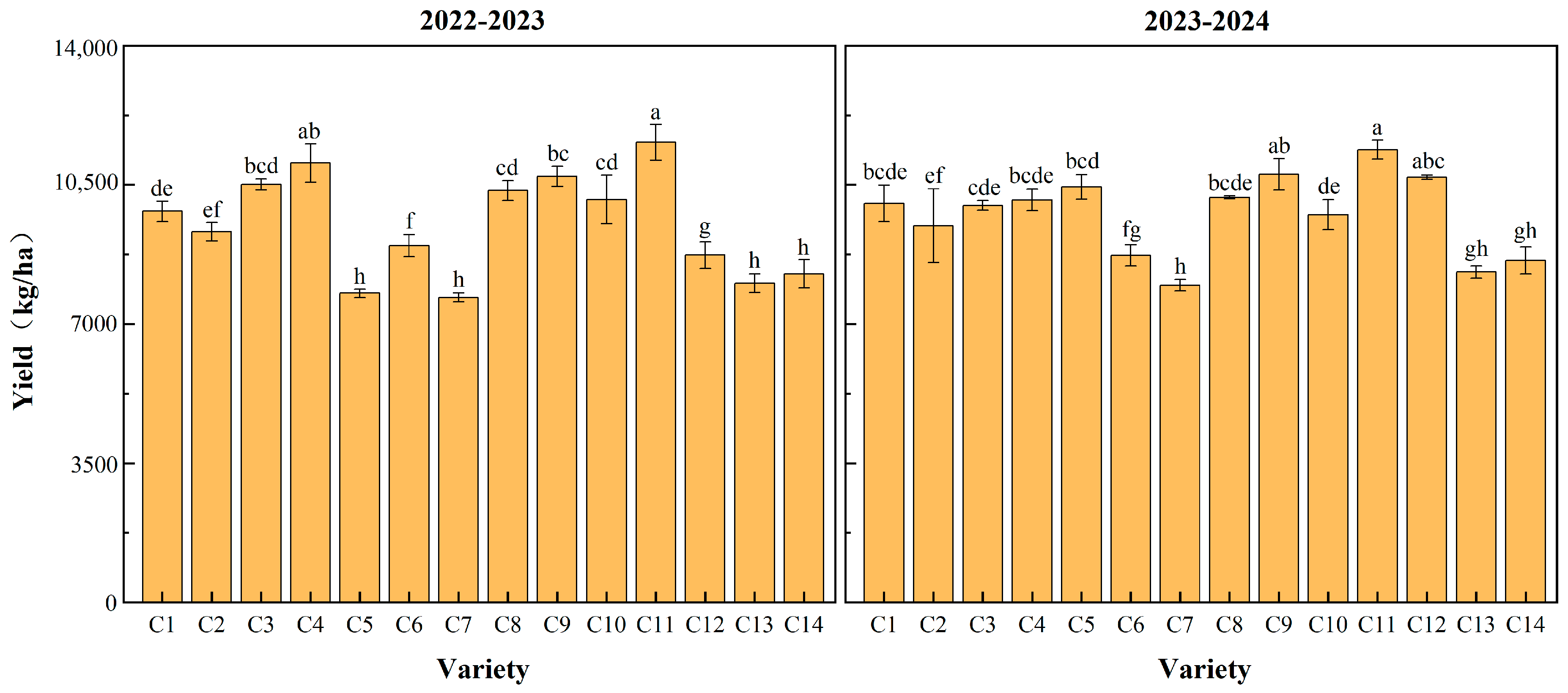 | 2023–2024 | Annon 0711 | 974 ± 54 bc | 440 ± 17 e | 1151 ± 90 cd | 534 ± 68 cd | 711 ± 93 cde |