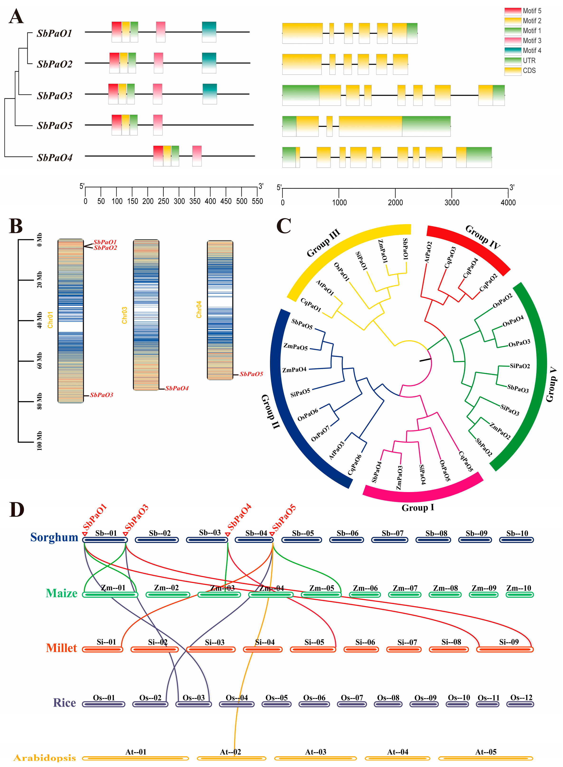3.1. Genome-Wide Identification of PaOs Genes in Sorghum