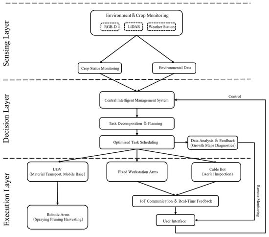 Transforming standalone robotic technologies into an efficient, autonomous unmanned greenhouse hinges on the construction of an integrated, multi-layered system framework designed to coordinate and manage the farm’s entire range of monitoring and operational tasks [65]. The framework for an unmanned greenhouse relies on a system that tightly integrates data acquisition, intelligent decision-making, and physical execution (Figure 2). The core concept of this framework is to use a central intelligent dispatching system to command a heterogeneous team of specialized robots. This team works collaboratively, supported by the Internet of Things (IoT), to ultimately achieve full-process automation of greenhouse production [66,67].