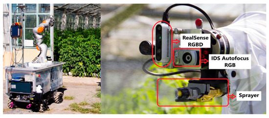 A typical targeted spraying robot system is an integrated mobile manipulation platform that combines various complex technologies, including autonomous navigation, environmental perception, path planning, and precise manipulation. Martin [15] developed a generic, ROS-based control architecture for this purpose. The system consists of a mobile base, a multi-DOF robotic arm, and a perception and execution module mounted at the end-effector, such as a 3D camera and a nozzle (Figure 4). Its standard operational workflow is as follows: the robot first navigates autonomously to the target plant; then uses its vision system to identify the leaves or areas that require treatment; and finally, the robotic arm plans and executes a collision-free path to precisely move the nozzle to the target location for spot spraying. This modular architecture greatly simplifies the development of new applications, allowing the robot to flexibly perform the complete closed-loop task from disease detection to precision spraying.