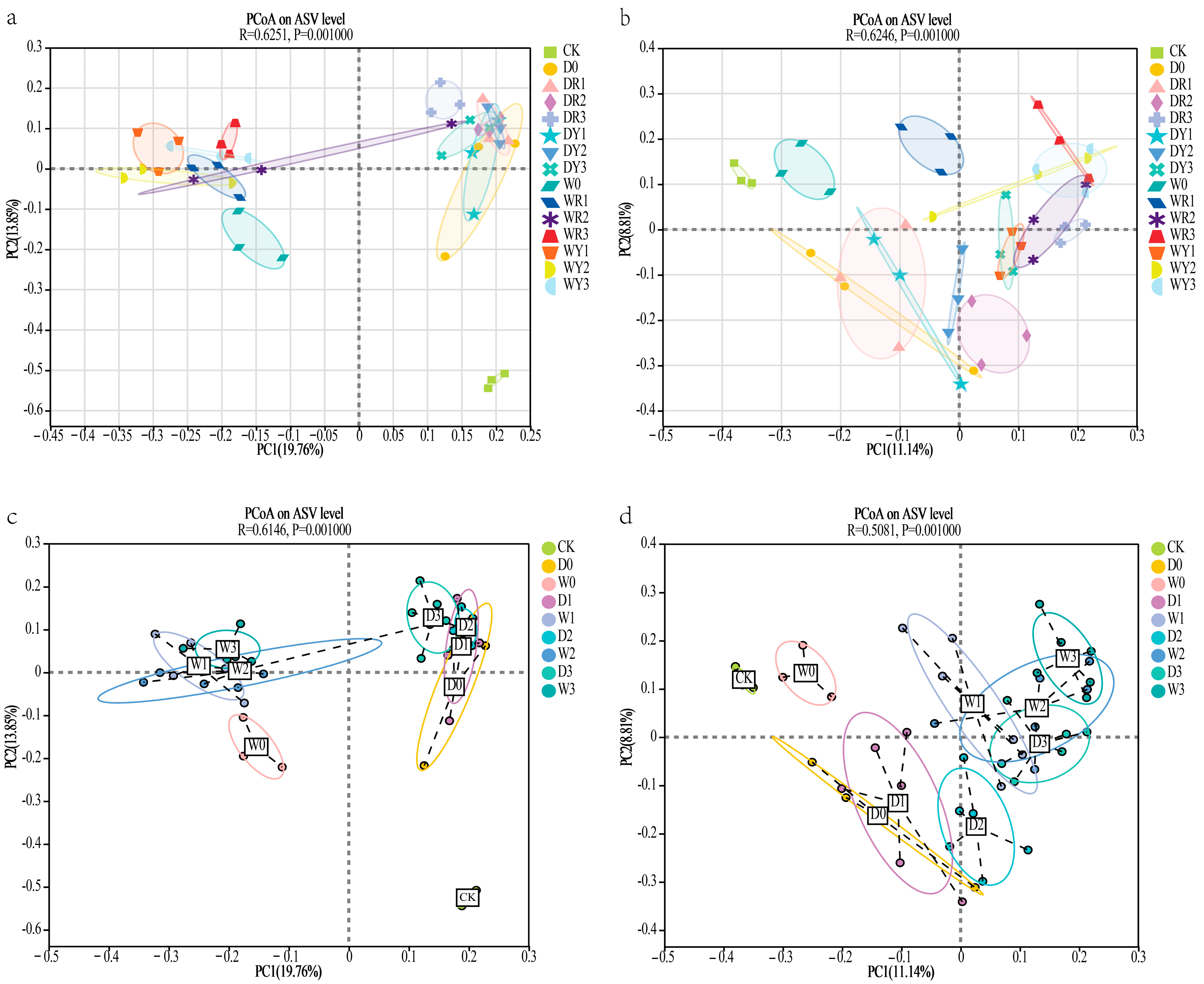 3.2.3. Similarity Analysis of Soil Microbial Communities in Dryland/Irrigated Rice–Potato Double Cropping Systems