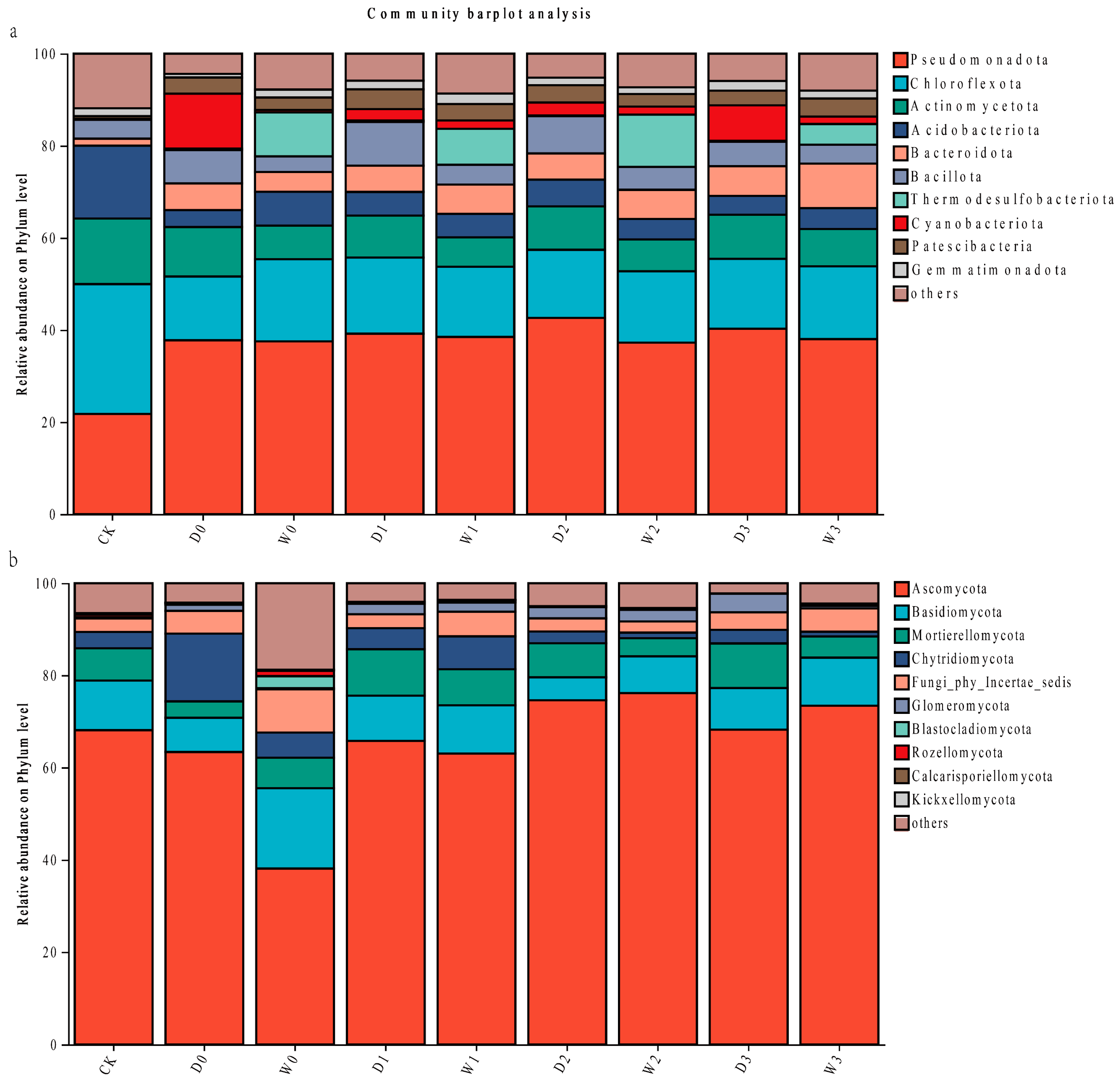 3.2.4. Soil Microbial Community Composition Analysis at Phylum Level