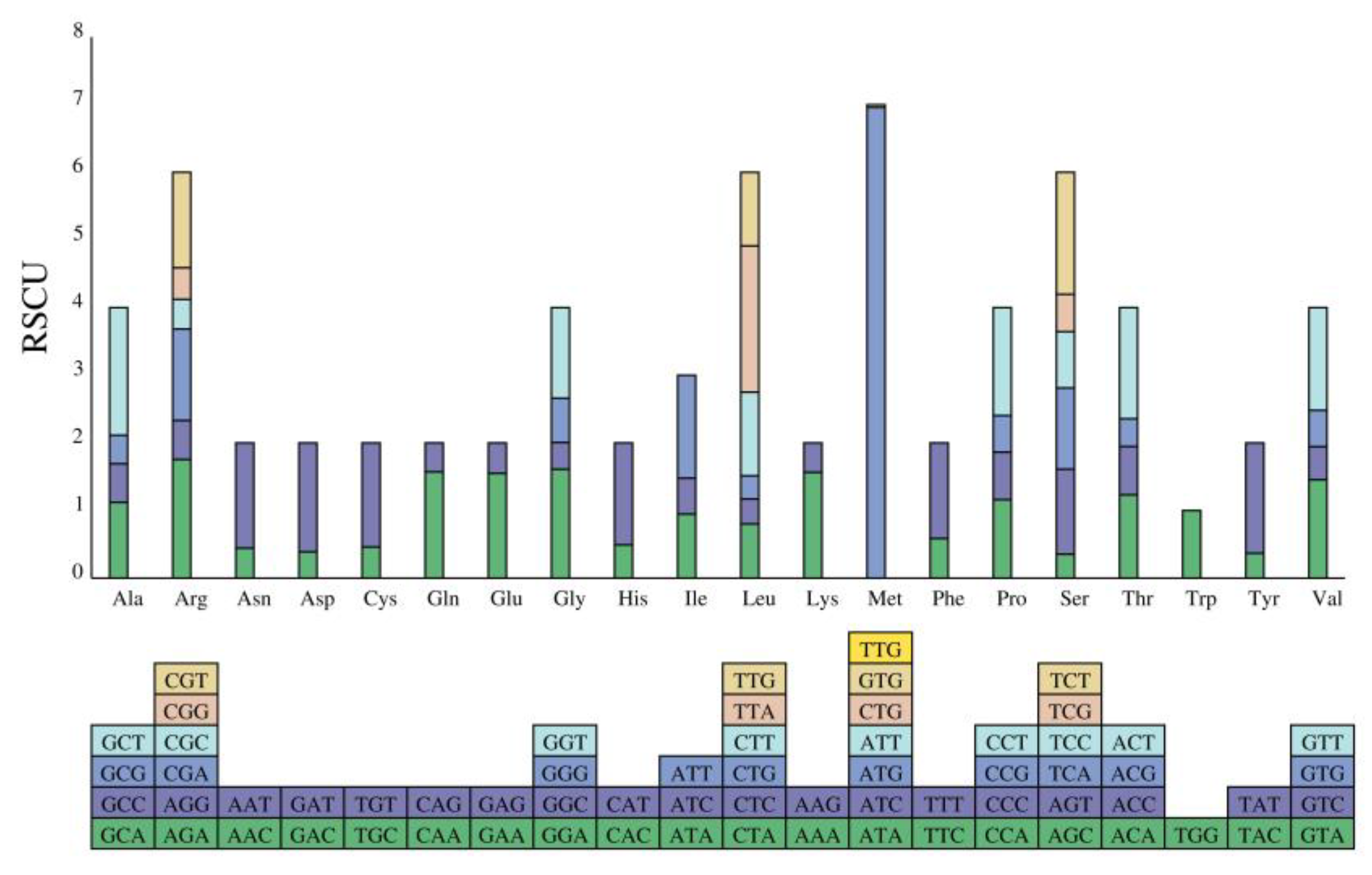 A comprehensive analysis of the B. juncea var. multiceps chloroplast genome revealed that 22,773 codons were used for amino acid translation. Among these, leucine (Leu) codons were the most abundant, totaling 2417 instances. Codons for isoleucine (Ile) and serine (Ser) followed, with 1976 and 1694, respectively (Table S2). The relative synonymous codon usage (RSCU) analysis showed 29 of 31 codons with RSCU > 1 end in A/U and 30 of 33 codons with RSCU < 1 end in G/C. This A/U preference is a hallmark of chloroplast genomes. The RSCU analysis revealed distinct patterns. The AUG codon acts as the primary translation initiation signal; it showed the highest RSCU value of 6.9594. This overrepresentation stems from the genomic architecture, as every protein requires a start codon. In contrast, GUG is a rare alternative start codon for methionine; it displayed the lowest RSCU value of 0.0406. This low frequency suggests poor recognition by the chloroplast translation initiation machinery. As expected, UGG, the sole codon for tryptophan, had an RSCU of 1.0. This result aligns with the universal genetic code, where tryptophan has no synonymous codons (Figure 2).