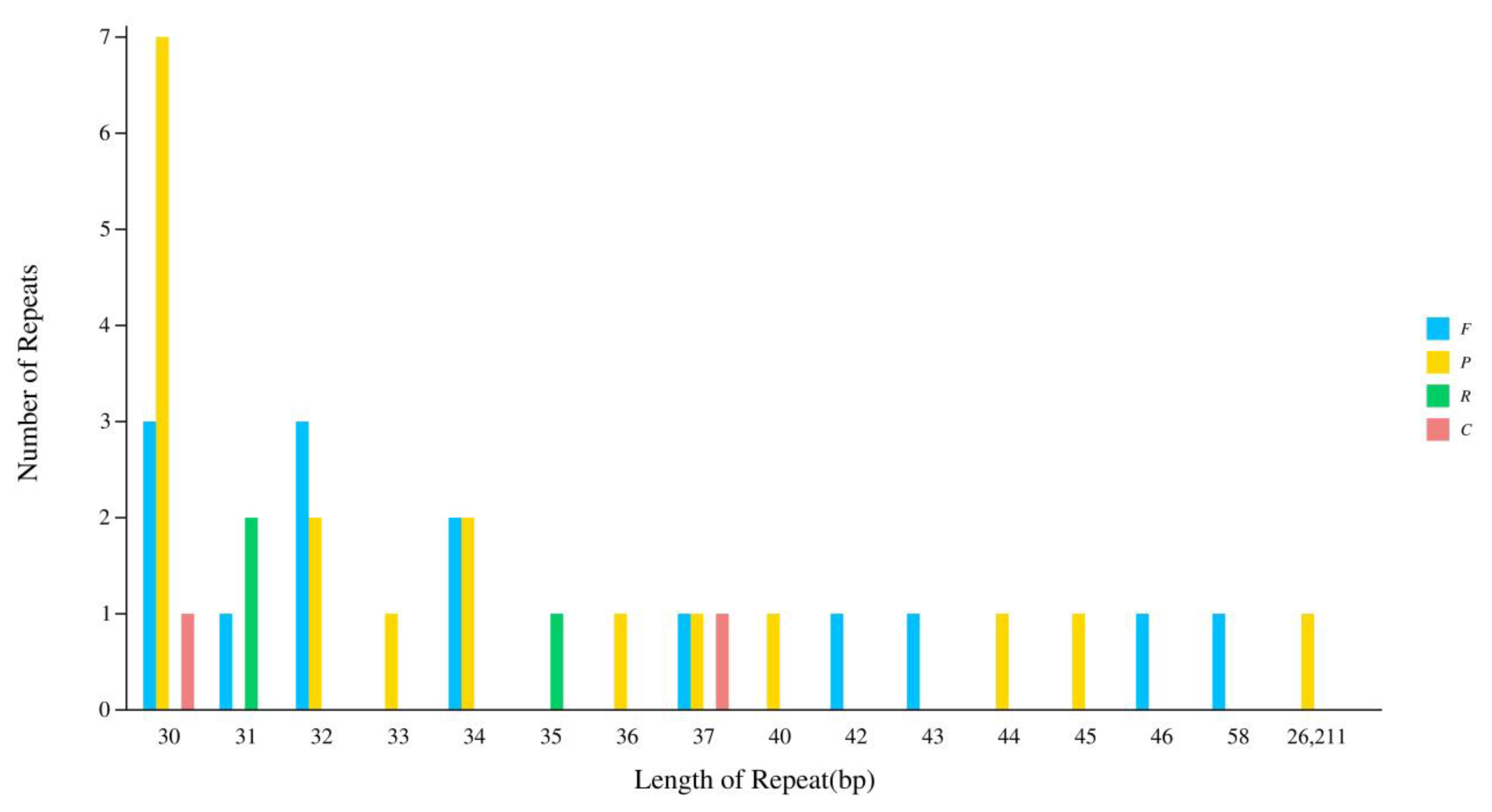 Statistical chart of interspersed repeat sequences in the B. juncea var. multiceps chloroplast genome. F = direct repeats; P = palindromes; R = inverted repeats; C = complementary repeats.