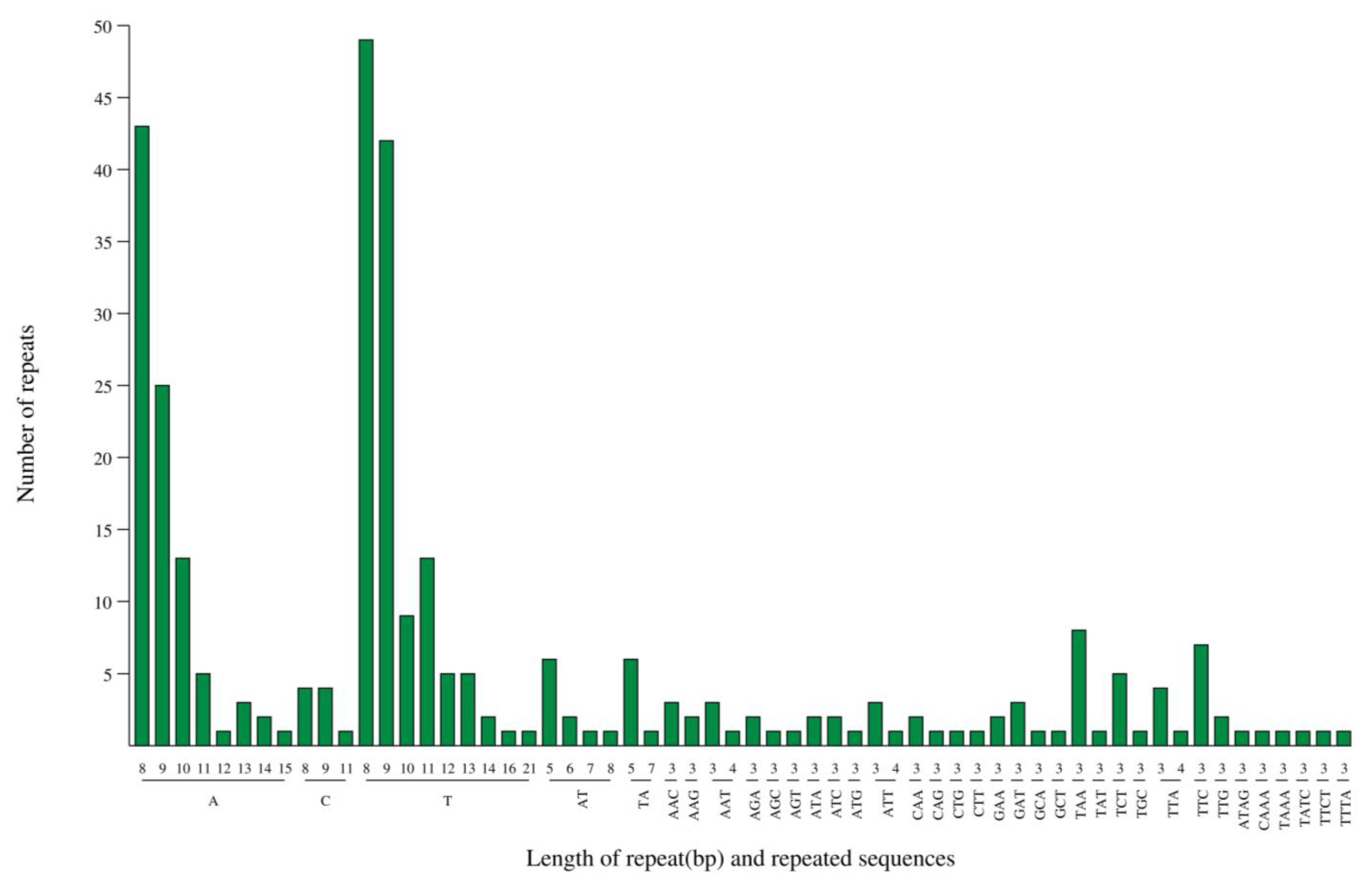 Repetitive sequences were identified using vmatch v2.3.0 combined with Perl scripts, with the following stringent parameters applied: minimum sequence length of 30 bp and a maximum Hamming distance of 3. Simple sequence repeats (SSRs) were detected using MISA v1.0 software [24], with parameters set as 1–8 (mononucleotide repeats with ≥8 repeats), 2–5, 3–3, 4–3, 5–3, and 6–3.
