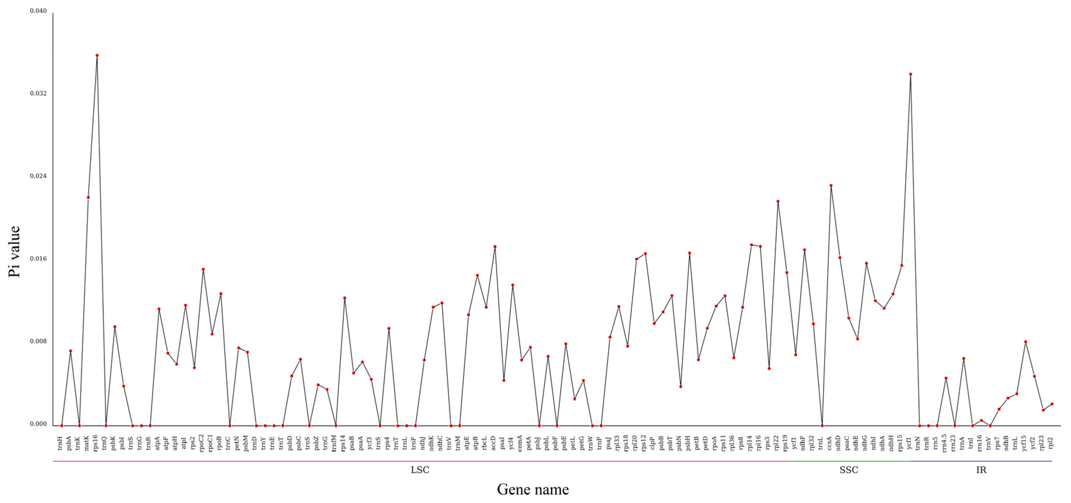 Analysis of chloroplast genome nucleotide diversity (Pi) across eight Brassicaceae species showed a mean Pi value of 0.0075 (Figure 5, Table S4). Nucleotide diversity varied markedly across different regions of the chloroplast genome. The LSC region exhibited Pi values ranging from 0 to 0.0359, with a mean of 0.0074, while the SSC region showed values from 0 to 0.0341 and a mean of 0.0138. In stark contrast, the IR regions displayed significantly lower diversity, with Pi values ranging from 0 to only 0.0081 and a mean of 0.0022 (Figure 5). Nucleotide diversity analysis identified five highly variable regions: three in the LSC region (rps16, matK, and rpl22) and two in the SSC region (ycf1 and ccsA). Among these, the rps16 gene exhibited the highest genetic diversity.
