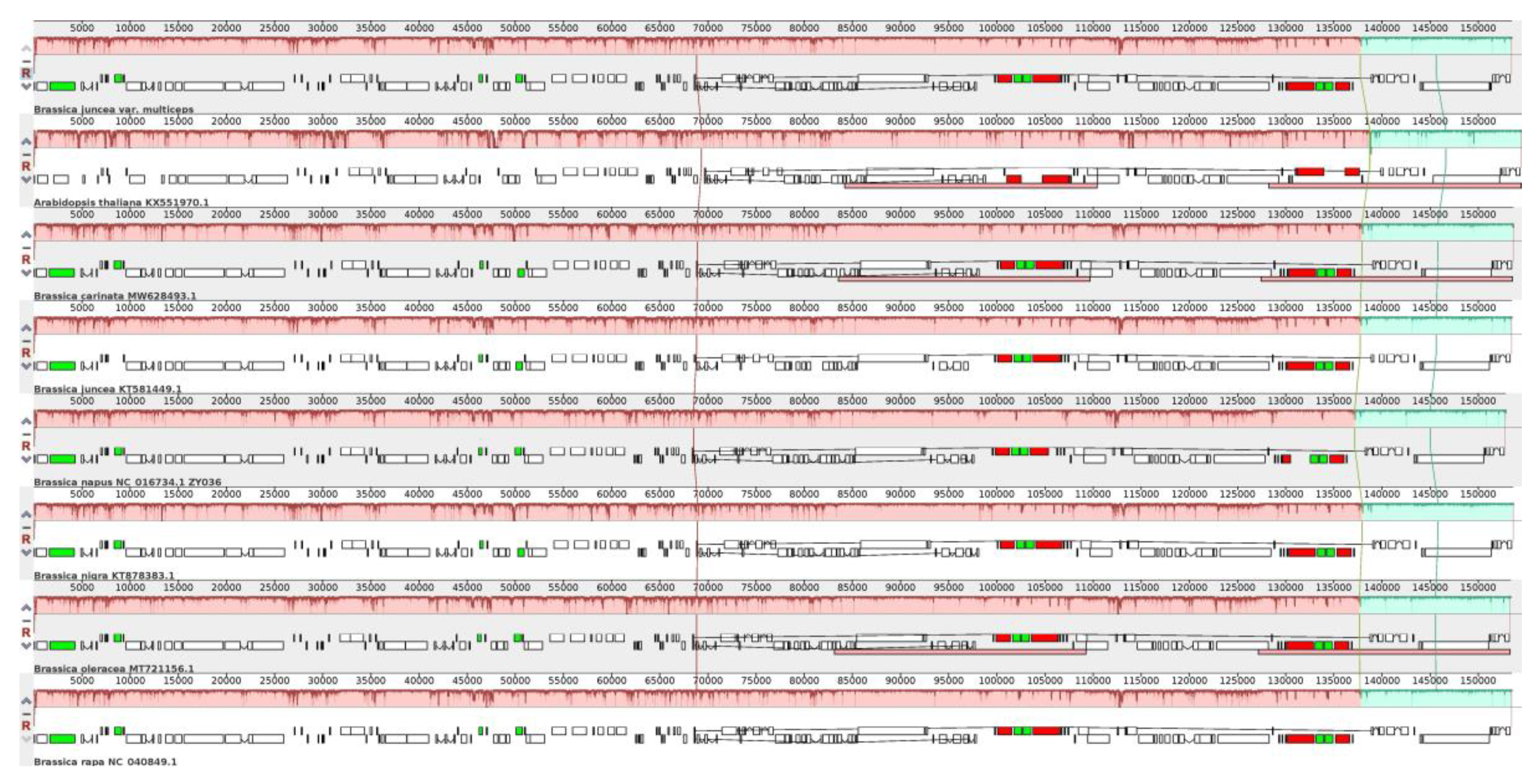 Analysis of chloroplast sequence homology among eight Brassicaceae plants. The illustration employs hues to represent genomic loci: CDS (white), tRNA (green), and rRNA (red). The shaded local collinear blocks highlight regions with homologous alignment to another genome. If a block appears above the central axis, it signifies forward alignment relative to the reference genome’s sequence, while those below the axis represent reverse-complement alignment. Unshaded areas indicate no detectable homology between the compared genomes. Mauve generates a similarity profile within each aligned block, where the profile’s peak height reflects the average sequence conservation in that region. Connecting lines between the colored blocks illustrate collinear relationships, showing conserved synteny across the genomes.