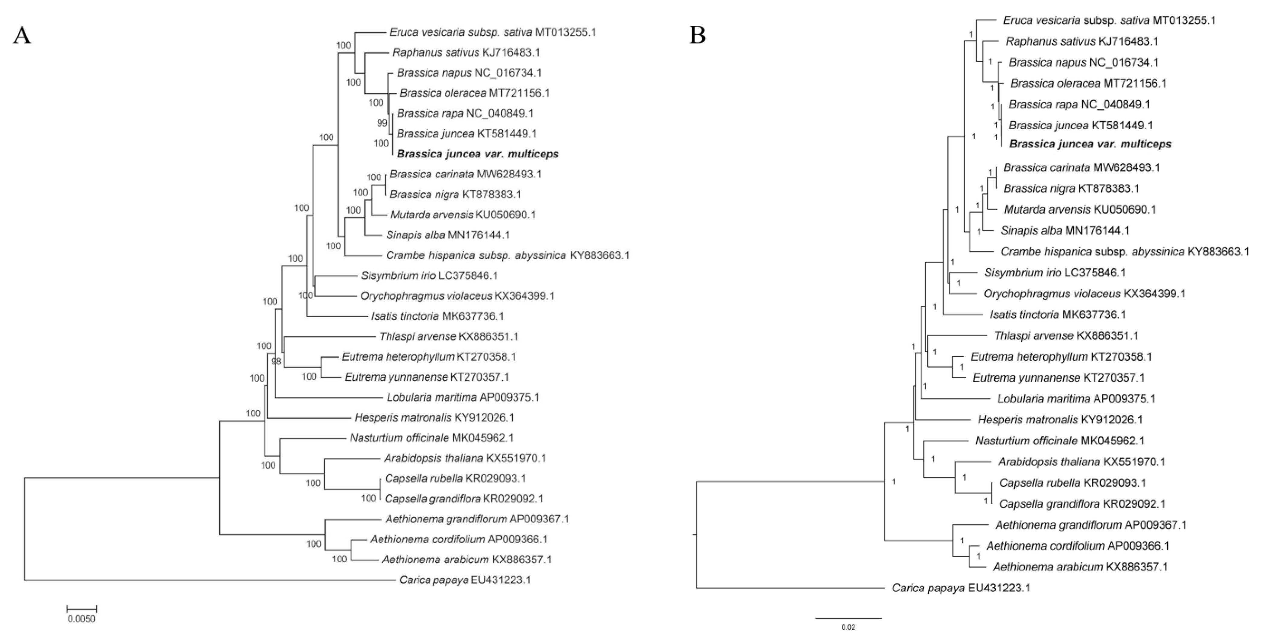 Phylogenetic trees were constructed using two methods: BI and ML (Figure 7). The results showed that the trees generated via these two approaches displayed consistent topologies with high support values, with only minor discrepancies observed at select nodes. In the ML tree, B. juncea and B. juncea var. multiceps formed a sister group, and the node support value between this sister clade and B. rapa was 99%; in contrast, the corresponding node support in the BI tree reached 100%. We revealed that within the genus Brassica, B. juncea and B. juncea var. multiceps shared the closest evolutionary affinity, followed sequentially by B. rapa, B. oleracea, and B. napus. Among taxa outside the genus Brassica, R. sativus (genus Raphanus) showed the closest evolutionary affinity to B. juncea var. multiceps, followed by E. vesicaria subsp. sativa (genus Eruca). As expected for an outgroup, C. papaya displayed the farthest evolutionary distance from B. juncea var. multiceps. Notably, the phylogenetic topology recovered the genus Brassica as non-monophyletic: non-Brassica genera (e.g., Raphanus, Eruca) were nested within the broader clade that included all sampled Brassica species, rather than forming a distinct monophyletic group exclusive to Brassica.