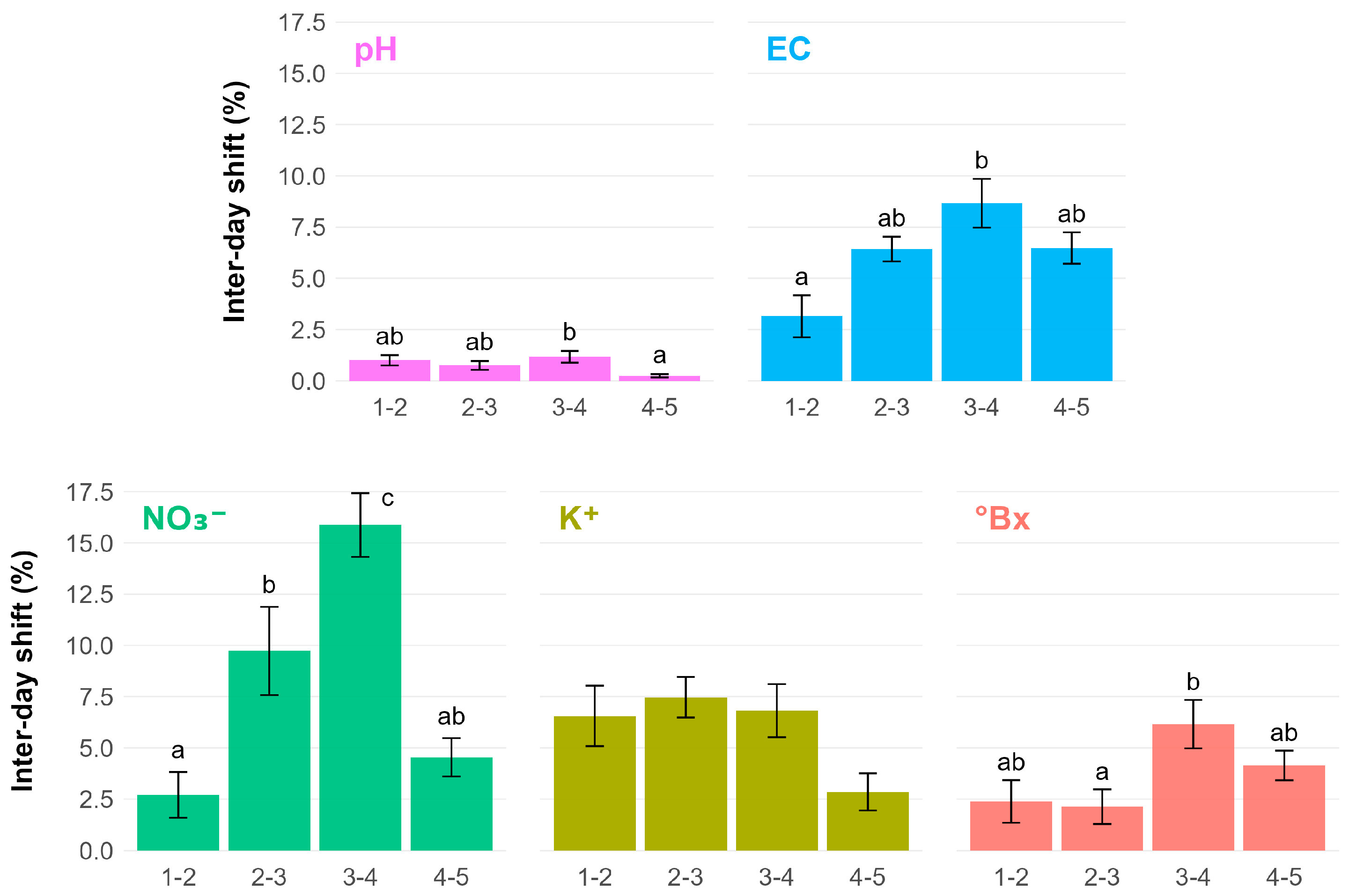 Chicago/Turabian StyleSanta Cruz, Javier, Diego Calbucheo, Samuel Valdebenito, Javiera Cortés, Constanza Gautier, Aanisa Amín, Ignacia Hernández, Hernán Allendes, and Patricia Peñaloza. 2025. "Inter-Day Instability in Plant Sap Composition Undermines Single-Day Diagnostics" Agronomy 15, no. 11: 2509. https://doi.org/10.3390/agronomy15112509
