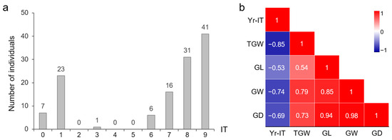 The grain traits of individual F2 plants were also separated and exhibited transgressive segregation (Table 1). The degree of grain type dispersion (CV = 0.11~0.17) was lower than TGW (CV = 0.39). Correlation analysis showed that there was a positive correlation among grain phenotypes, while the IT was significantly negatively correlated with TGW and grain size, suggesting that the stronger the resistance of a plant to YR, the larger the grain size and the higher the grain weight (Figure 2b).