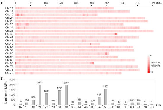Distribution of SNP markers on wheat chromosomes. (a) SNPs on 120K-4HWA chip. (b) SNP markers showing polymorphism between parents C855 and YN999.