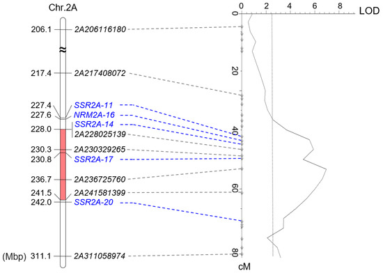 QYr.sxau-2A.1 was mapped to a 13.56 Mbp physical interval flanked by SNP markers 2A228025139 and 2A241581399 (Table 2). We randomly designed SSR primer pairs within the genome segment, and additionally selected a set of NBS-related microsatellite (NRM) markers [29] located on chromosome 2A to verify the mapping results. Finally, four pairs of SSR primers, including SSR2A-11, SSR2A-14, SSR2A-17, and SSR2A-20, as well as one NRM marker NRM2A-16, which closed to NBS-LRR gene TraesCS2A02G225000, showed polymorphisms between C855 and YN999, and were then integrated into the QYr.sxau-2A.1 map by amplifying the YN999 × C855 F2 population. The marker under the peak was 2A236725760 (Figure 4).