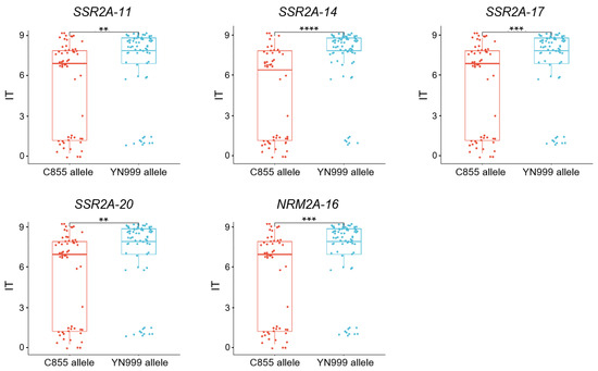 We analyzed the genotypes, with the exception of the heterozygotes of linked markers. For all the markers, the C855 allele of QYr.sxau-2A.1 corresponded to the lower IT scale, while the NY999 allele of QYr.sxau-2A.1 corresponded to the higher IT scale. The phenotypic differences between the two alleles of SSR2A-14 (p = 2.4 × 10−7) within the QTL were more significant than those of markers SSR2A-11 (p = 0.0032), SSR2A-17 (p = 0.0008), SSR2A-20 (p = 0.0027), and NRM2A-16 (p = 0.0001) (Figure 5). Hence, SSR2A-14 was used as the diagnostic marker for allelic variation in QYr.sxau-2A.1.