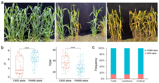 Assessment of QYr.sxau-2A.1. (a) Plant phenotype of YN999 × C855 F2:3 lines inoculated with mixed Pst isolates, including resistant (left), separation (middle), and susceptive (right). (b) Significant differences analysis in IT and TGW between the two alleles of QYr.sxau-2A.1 in YN999 × C855 F2:3 lines. **** indicates p < 0.0001. (c) Distribution frequency of the two alleles of QYr.sxau-2A.1 in 114 varieties, including 62 landraces and 52 cultivars.