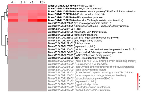 Expression patterns of 30 annotated genes within QYr.sxau-2A.1 region in flag leaf of wheat inoculated with Pst isolate CYR31. Unexpressed genes are marked by asterisks, and highly expressed genes are displayed in bold. From gray to red, the FPKM value goes from low to high.