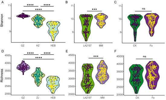 Alpha diversity of tomato rhizosphere microbiomes. Shannon and Richness indices of microbiota across various soil types ((A,D); n = 36). Shannon and Richness indices of the microbiota in two tomato genotypes ((B,E); n = 54). Bar charts depicting the influence of pathogen Fol inoculation on the microbiota’s Shannon and Richness indices ((C,F); n = 54). LA2157 and MM represent the tomato genotypes LA2157 and Moneymaker, respectively. GZ, Guangzhou; HZ, Hangzhou; HEB, Harbin. CK refers to the control treatment without pathogen Fol inoculation, and Fo refers to the treatment with Fol inoculation. *** and **** indicate significant difference at p < 0.001 and p < 0.0001 (t test or Tukey’s HSD test), respectively.