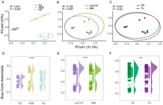 Patterns of beta diversity in the microbiomes of tomato rhizospheres. PCoA analysis of microbial communities in each microhabitat for the three soil types ((A), n = 36), two tomato genotypes ((B), n = 54), and Fol pathogen inoculation versus control treatments ((C), n = 54). Different groups are highlighted by ellipses and point colors. PERMANOVA tests were employed to evaluate the significance of differences in microbial communities between groups. Beta-dispersion analysis of rhizobacterial communities for soil types (D), different genotypes (E), and pathogen inoculation treatments (F) based on Bray–Curtis dissimilarity (Wilcoxon rank-sum test). LA2157 and MM represent the tomato genotypes LA2157 and Moneymaker, respectively. GZ, Guangzhou; HZ, Hangzhou; HEB, Harbin. CK refers to the control treatment without pathogen Fol inoculation, and Fo refers to the treatment with Fol inoculation. *** and **** indicate significant difference at p < 0.001 and p < 0.0001 (t test or Tukey’s HSD test), respectively.