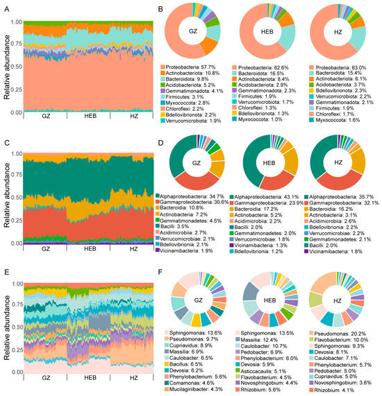Taxonomic composition of the tomato microbiome across different soil types. (A) A bar plot of phyla abundances in GZ, HEB, and HZ. (B) A pie plot of the top 10 phyla of microbiota in GZ, HEB, and HZ. (C) Relative proportions of the most frequent classes in GZ, HEB, and HZ. (D) A pie plot of the top 10 classes of microbiota in GZ, HEB, and HZ. (E) Relative proportions of the most frequent genera in GZ, HEB, and HZ. (F) A pie plot of the top 10 genera of microbiota in GZ, HEB, and HZ. GZ, Guangzhou; HZ, Hangzhou; HEB, Harbin. Tukey’s HSD test, n = 36.