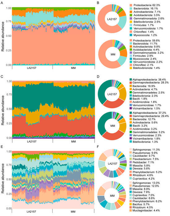 The taxonomic profile of the tomato microbiome in the two genotypes. (A) A bar chart showing the abundance of phyla in the LA2157 and MM genotypes. (B) A pie plot of the top 10 phyla of microbiota in the LA2157 and MM genotypes. (C) A bar chart showing the abundance of classes in the LA2157 and MM genotypes. (D) A pie plot of the top 10 classes of microbiota in the LA2157 and MM genotypes. (E) Relative proportions of the most frequent genera in the LA2157 and MM genotypes. (F) A pie plot of the top 10 genera of microbiota in the LA2157 and MM genotypes. LA2157 and MM represent the tomato genotypes LA2157 and Moneymaker, respectively. Sidak’s test, n = 54.
