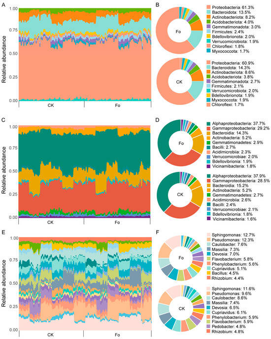 Changes in the taxonomic composition of the tomato microbiome induced by Fol inoculation. (A) A bar plot of phyla abundances present in Fol inoculated and CK groups. (B) A pie plot of the top 10 phyla of microbiota in Fol inoculated and CK groups. (C) A bar plot of class abundances present in Fol inoculated and CK groups. (D) A pie plot of the top 10 classes of microbiota in Fol inoculated and CK groups. (E) Relative proportions of the most frequent genera in Fol inoculated and CK groups. (F) A pie plot of the top 10 genera of microbiota in Fol inoculated and CK groups. CK refers to the control treatment without pathogen Fol inoculation, and Fo refers to the treatment with Fol inoculation. Sidak’s test, n = 54.