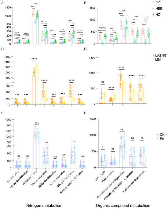 Functional signatures in the tomato rhizosphere. The functional differences analysis of microbial communities in each microhabitat for the three soil types ((A,B); n = 36), two tomato genotypes ((C,D); n = 54), and Fol pathogen inoculation versus control treatments ((E,F); n = 54). LA2157 and MM represent the tomato genotypes LA2157 and Moneymaker, respectively. GZ, Guangzhou; HZ, Hangzhou; HEB, Harbin. CK refers to the control treatment without pathogen Fol inoculation, and Fo refers to the treatment with Fol inoculation. *, **, *** and **** indicate significant difference at p < 0.05, p < 0.01, p < 0.001 and p < 0.0001 (Sidak’s test or Tukey’s HSD test), respectively.