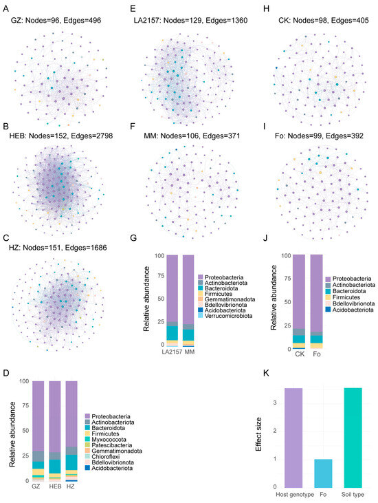 Tomato rhizobacterial interaction networks. Overview of microbial co-occurrence networks for GZ (A), HEB (B) and HZ (C). (D) Taxonomic composition of network nodes in GZ, HEB, and HZ. Overview of microbial co-occurrence networks for LA2157 (E) and MM (F). (G) Taxonomic composition of network nodes in LA2157 and MM. Overview of microbial co-occurrence networks for Fol inoculated (H) and CK groups (I). (J) Taxonomic composition of network nodes in Fol-inoculated and CK groups. (K) Relative effects of soil type, plant genotype, and pathogen inoculation on network topology. CK refers to the control treatment without pathogen Fol inoculation, and Fo refers to the treatment with Fol inoculation.