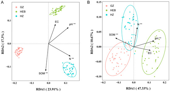 Given that soil type was identified as the primary driver of rhizobacterial community structure and function, we further explored the underlying mechanisms. Significant differences were observed in soil pH, soil organic matter (SOM), and total nitrogen (TN) among the three soil types (GZ, HEB, and HZ) (p < 0.05), whereas electrical conductivity (EC) did not differ significantly (Table S8). Redundancy analysis (RDA) indicated that soil pH, SOM, and TN were the main factors driving variation in microbial community composition (p < 0.01), with the first two constrained axes explaining 23.91% and 17.3% of the variance, respectively. The effect sizes followed the order TN > pH > SOM, while EC had no significant effect on community composition (Figure 8A). Similarly, RDA of rhizobacterial functional composition revealed that soil pH, SOM, and TN were also the key drivers of functional variation (p < 0.01), with the first two axes explaining 47.33% and 10.67% of the variance, respectively. In this case, the effect sizes followed the order pH > SOM > TN, whereas EC had no significant influence on functional composition (Figure 8B).