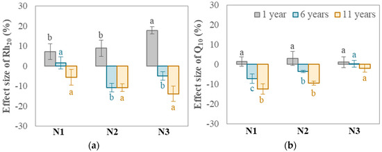 Effect sizes of Rh20 (a) and its Q10 (b) under long-term nitrogen fertilizer application conditions. Different lowercase letters indicate whether there exist significant differences in the comparison of effect sizes of Rh20 or Q10 under three diverse long-term nitrogen addition rates (three data points with identical duration are in the same comparison group), determined by Duncan’s test (p < 0.05). Letters are shown in the same color as in figure key to indicate each data point’s time property.