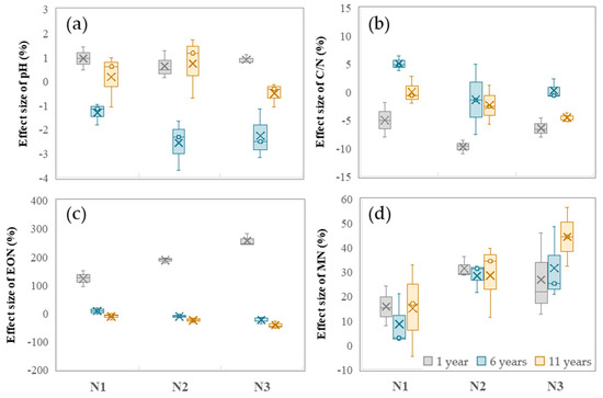 Long-term nitrogen fertilizer application significantly increased soil MN content, and the magnitude of the change became more significant with increasing nitrogen fertilizer application intensity and a longer treatment duration (Figure 3d). The EON content was increased by the nitrogen fertilizer application rate only in the 1-year planting condition, while it decreased with the increase in the application rate in the 6-year and 11-year planting conditions (Figure 3c). The soil C/N fluctuation caused by long-term nitrogen fertilizer application showed a downward trend in the 1-year condition and tended to be stable as the years of continuous nitrogen fertilizer application treatment were prolonged (Figure 3b). The pH value of rice field soil varied from −3% to 1% under long-term nitrogen fertilizer application and showed a decrease only in the 6-year condition, but it did not reach a significant level, and there was no significant difference between different nitrogen fertilizer application rates (Figure 3a).
