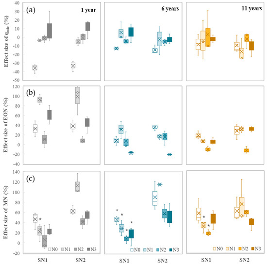 Response of soil qmic (a), EON (b), and MN (c) to short-term nitrogen addition. * The black-colored stars indicate whether there exist significant differences in the comparison of the effect size of qmic, EON, and MN under the same long-term nitrogen addition rates and different short-term nitrogen rates (two data points in the same comparison group have the same duration and long-term nitrogen rate, as well as different short-term nitrogen rates), determined by T test (p < 0.05). The absence of a star indicates that no significant differences exist in the given comparison group.
