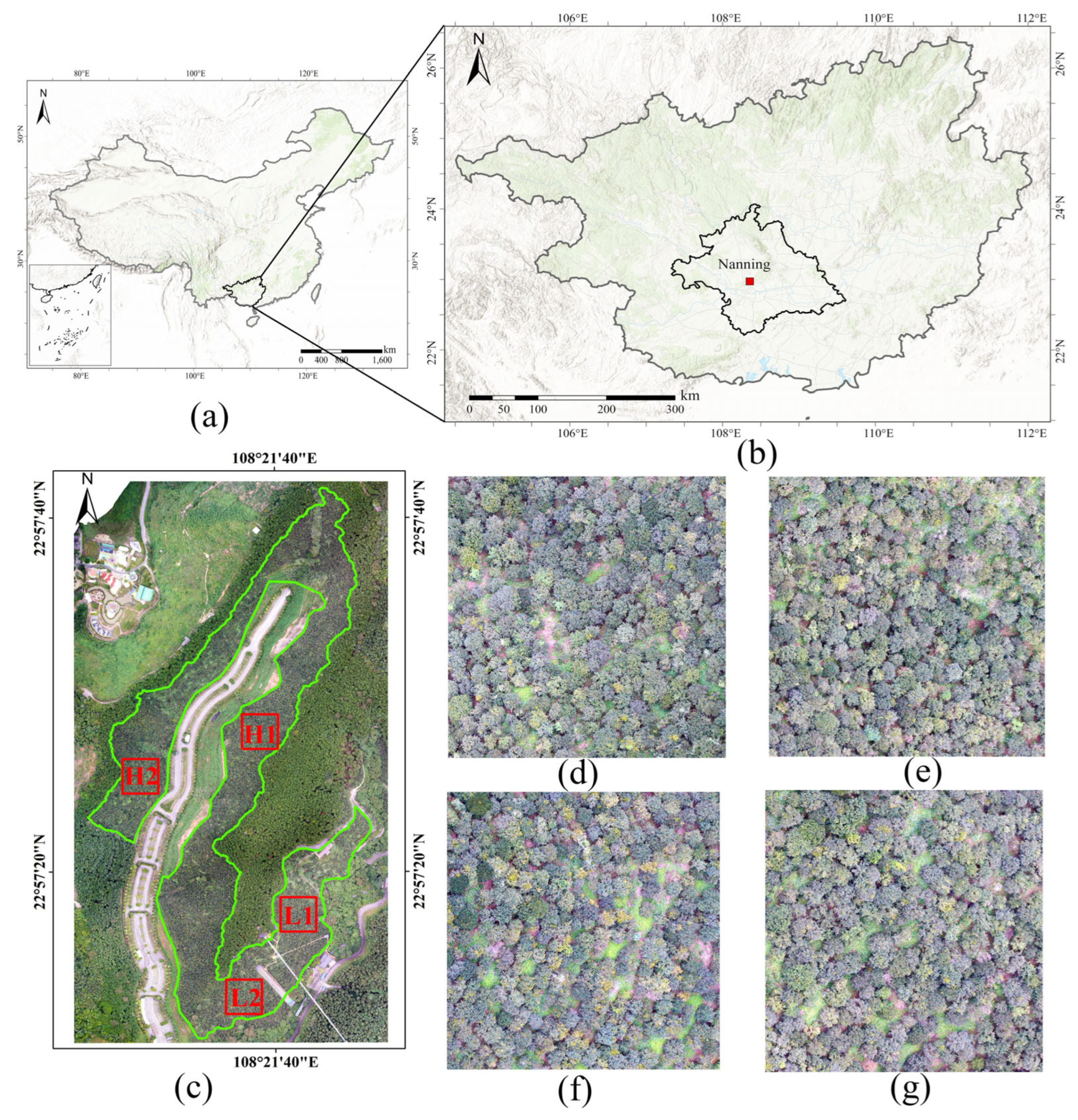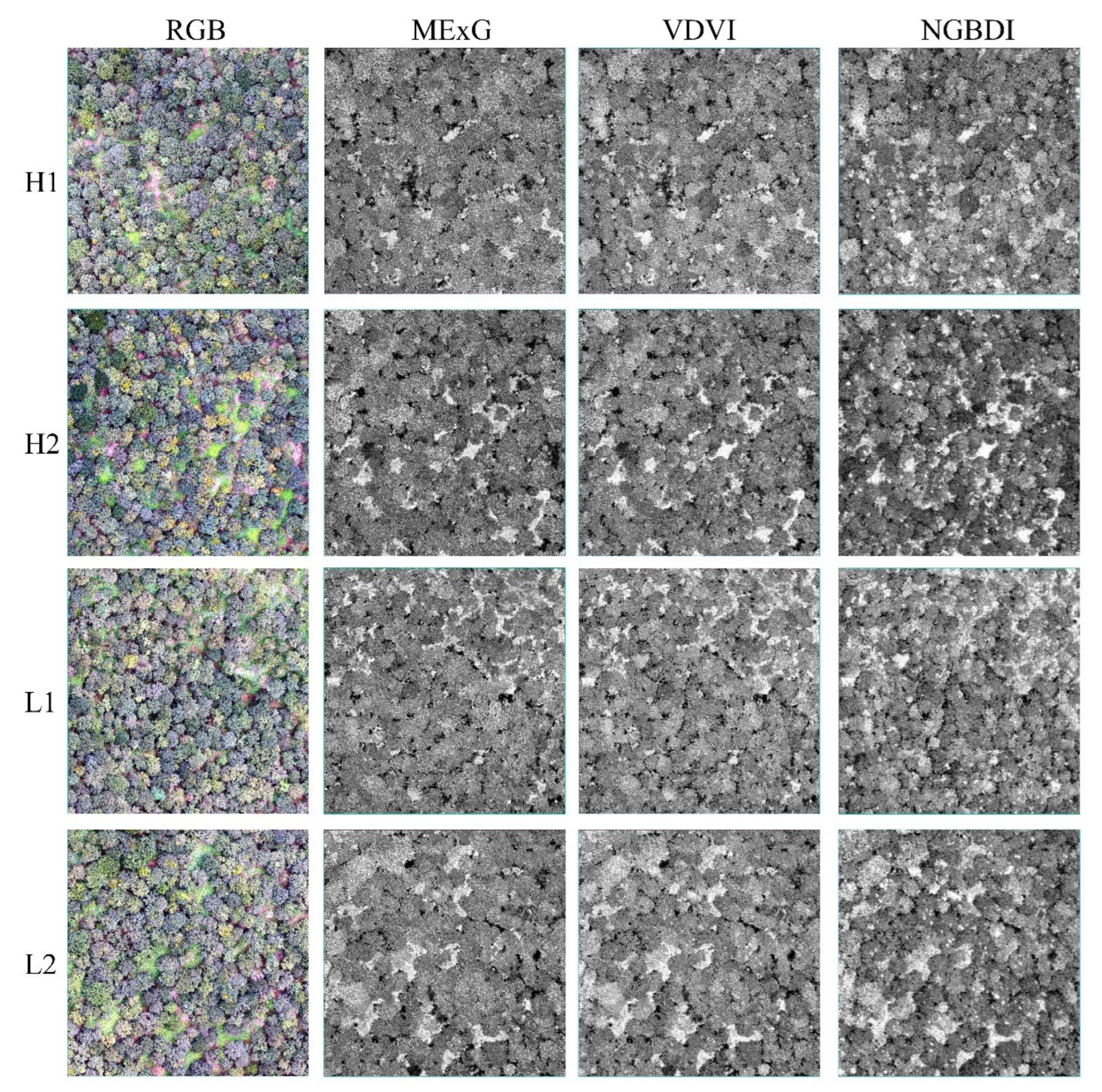 - Li, X.C.; Long, J.P. Research on UAV Image Enhancement Based on Visible Light Vegetation Index. Cent. South For. Inventory Plan. 2024, 43, 38–43. [Google Scholar]