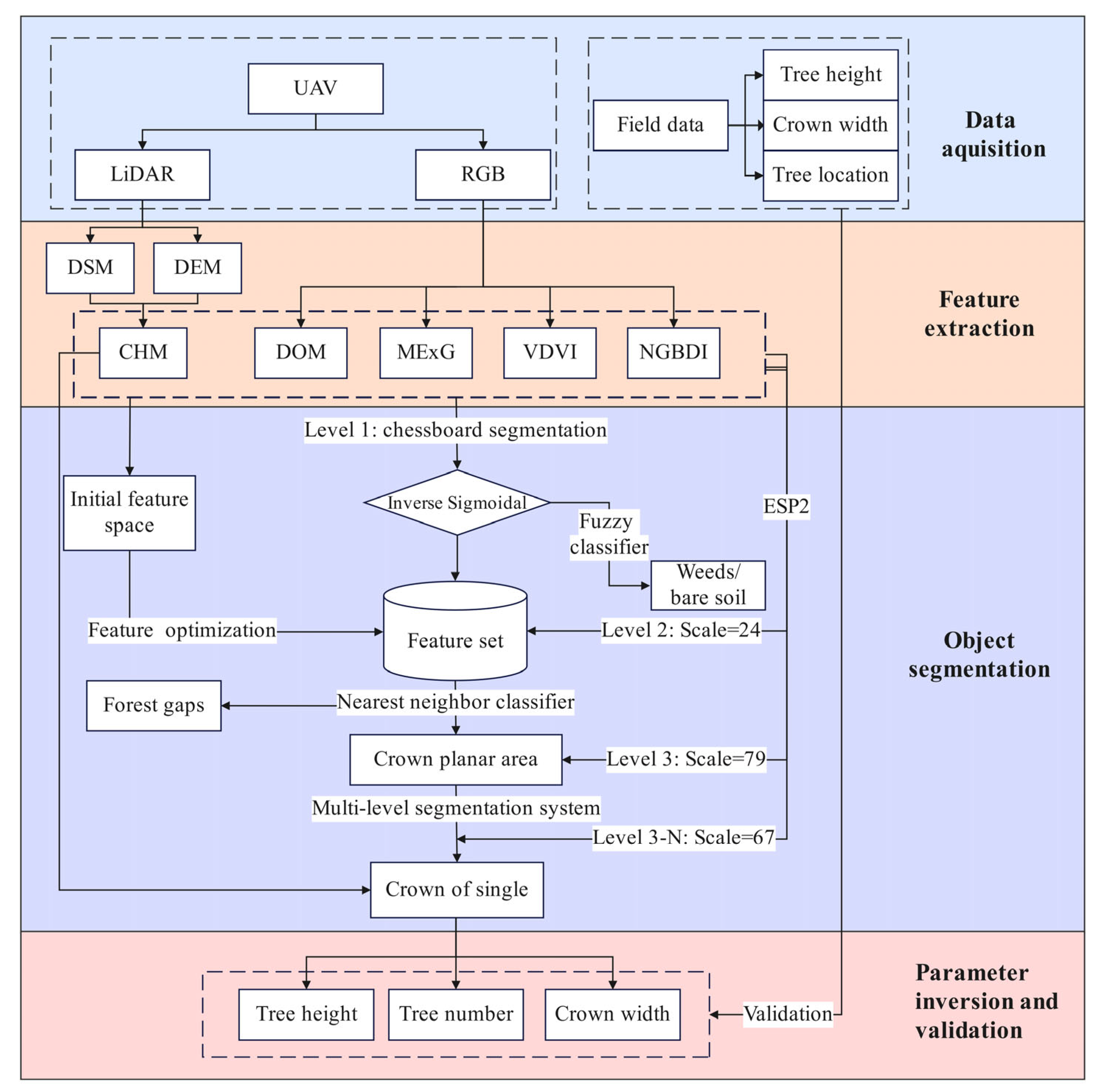 - Sun, Z.; Pan, L.; Sun, Y.J. Extraction of tree crown parameters from high-density pure Chinese fir plantations based on UAV image. J. Beijing For. Univ. 2020, 42, 20–26. [Google Scholar]