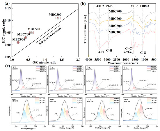 XPS analysis further supported these findings, revealing that carbon (C 1s, 284.8 eV) and oxygen (O 1s, 531.8 eV) were the dominant elements on the surface of biochar (Figure 1c). Deconvolution of the C 1s spectra identified three distinct peaks: graphitic carbon (C-C/C=C, ~284.83 eV), oxygenated single bonds (C-OH/C-O-C, ~286.01 eV), and carbonyl/carboxyl groups (C=O/O-C=O, ~288.5 eV). As the pyrolysis temperature increased, the proportion of C-C/C=C content increased by 3.21%, while C-OH/C-O-C and C=O/O-C=O decreased significantly. These changes indicate that decarboxylation and dehydroxylation reactions caused the reorganization of the carbon structure and enhanced aromaticity [43]. The O 1s spectra exhibited a similar trend, with the C=O (~531.8 eV) and C-O (~534.1 eV) peaks weakening in MBC300. The weakening of these oxygen-related peaks aligns with the progressive loss of oxygen-containing functional groups and stabilization of the carbon matrix upon temperature increase [44]. Such surface chemical reconstruction enhanced the aromaticity index and altered the carbon structure [45].