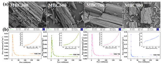 (a) SEM images of maize straw-derived biochar at different pyrolysis temperatures; (b) N2 adsorption–desorption isotherms and pore size distributions.