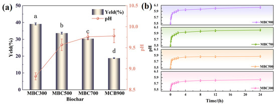 The biochar yield showed a three-stage response to pyrolysis temperature (Figure 3a). Within the pyrolysis temperature range of 300 °C to 500 °C, the yield decreased significantly from 39.15% to 33.67% (p < 0.05), primarily due to the decomposition of hemicellulose (240–350 °C) and cellulose (300 –400 °C). As the pyrolysis temperature increased from 500 °C to 700 °C, the decomposition of lignin became the dominant process [46], and the yield of biochar decreased from 33.67% to 30.67%. The yield of biochar exhibited a significant decline from 30.67% to 18.79% as the pyrolysis temperature increased from 700 °C to 900 °C, indicating that aromatization and mineral concentration processes intensified, accelerating the rate of mass loss [47]. As expected, the pH of the biochar increased from 8.82 to 9.78 with temperature increasing from 300 °C to 900 °C, likely due to the enrichment of alkaline minerals such as Ca2+, Mg2+, and K+ during pyrolysis, contributing to the liming effect of biochar. This trend was particularly significant in the MBC900 sample, which had the highest ash content and pH, further confirming the role of ash in enhancing alkalinity [43].