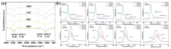 (a) FTIR spectra of biochar derived from different biomass at 700 °C. (b) XPS spectra of biochar produced from varied biomass sources under consistent thermal conditions (700 °C), showing C 1s and O 1s core-level spectra with deconvoluted peaks.