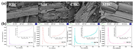 (a) SEM images of biochar at 700 °C from different biomass; (b) N2 adsorption–desorption isotherm and pore size distribution.