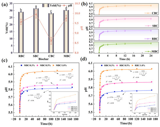 (a) Yield and pH of biochar pyrolyzed at 700 °C; (b) acid-neutralization performance of biochar (24 h); (c,d) pH increase of MBC at and RBC at different application rates. Different lowercase letters (a–d) above the bars indicate significant differences among treatments at p < 0.05 according to Duncan’s test.