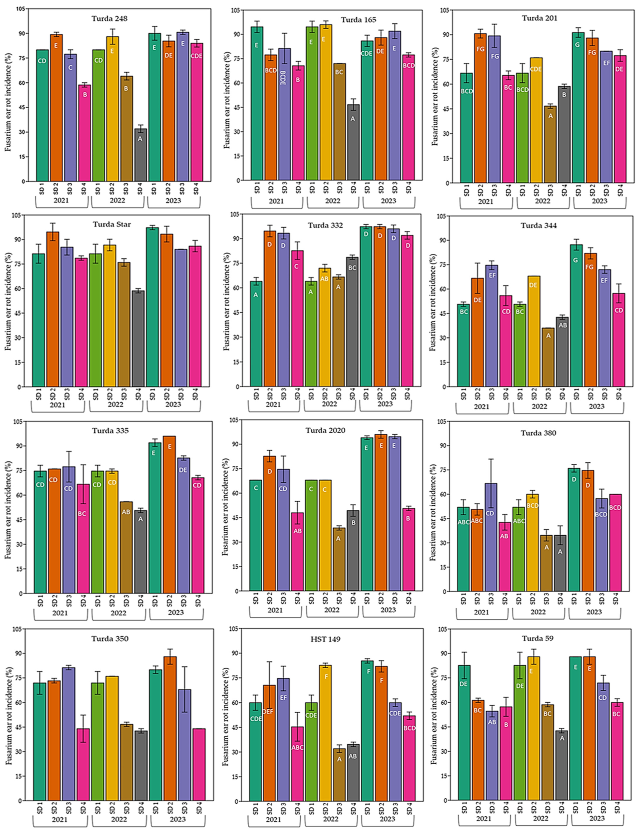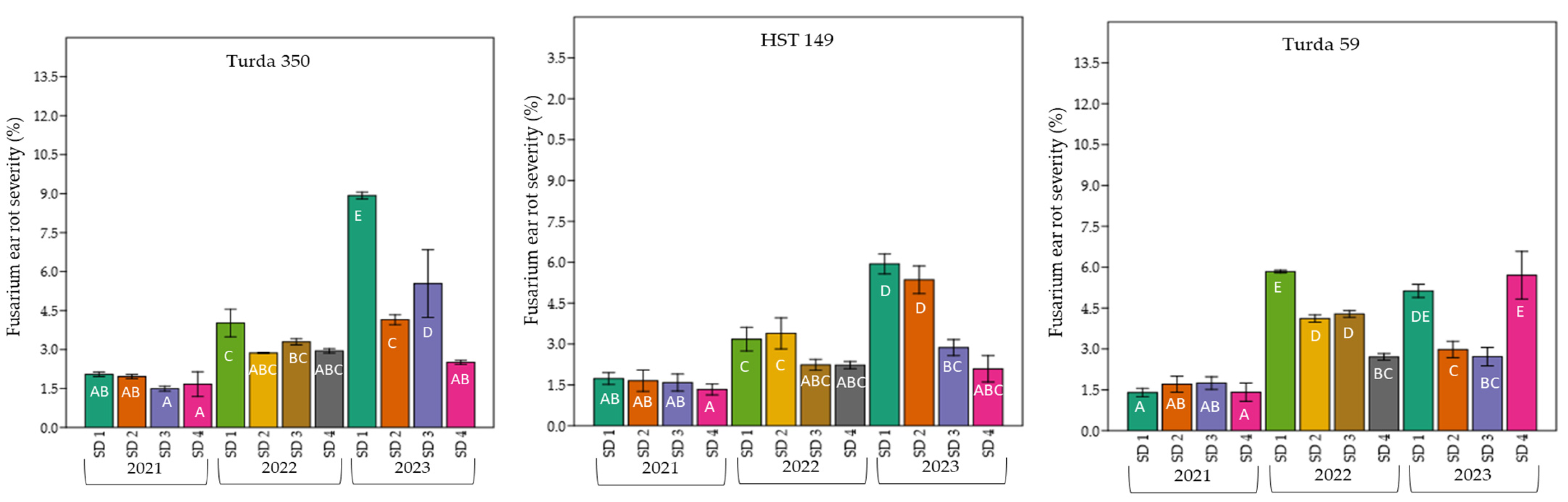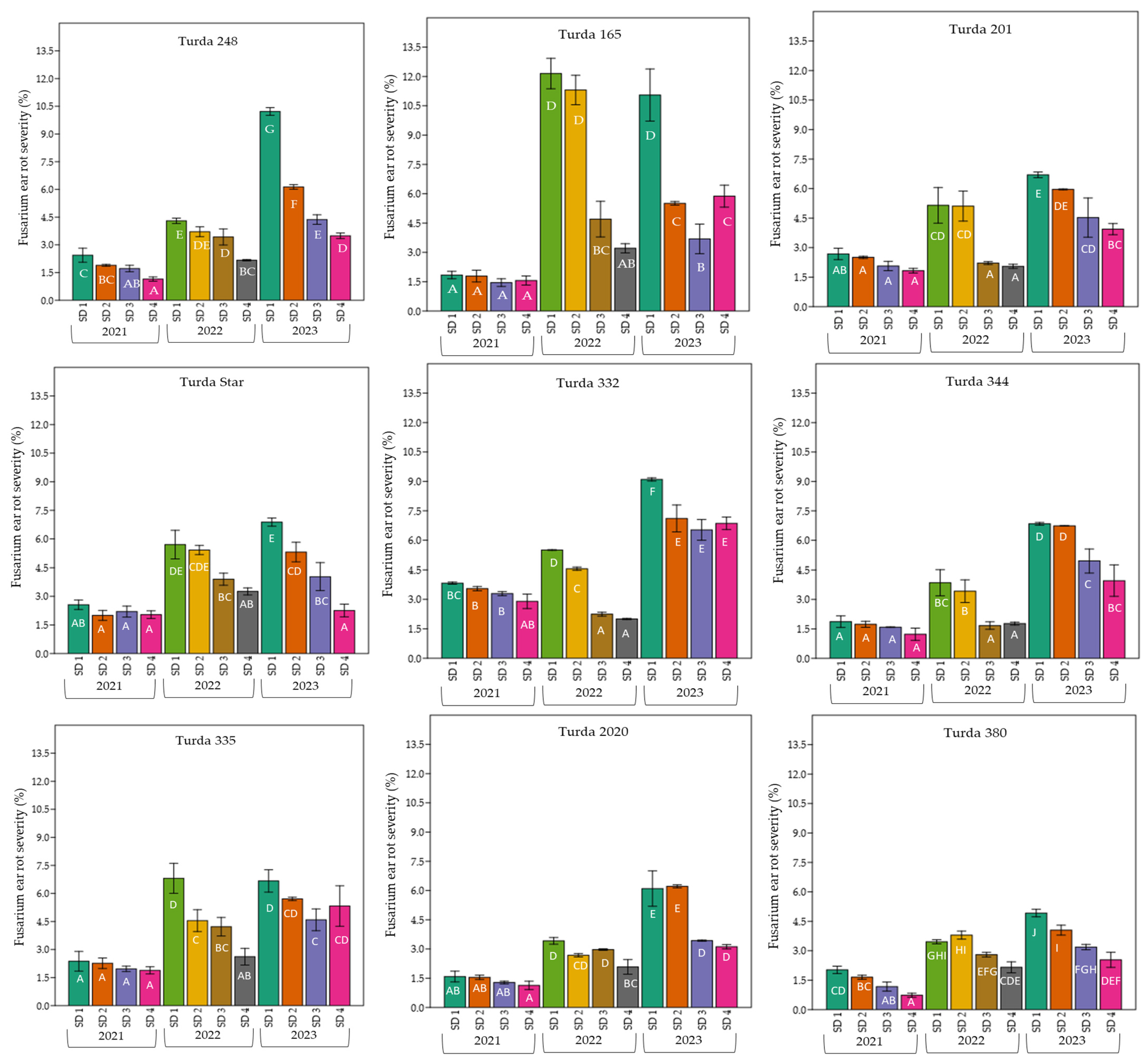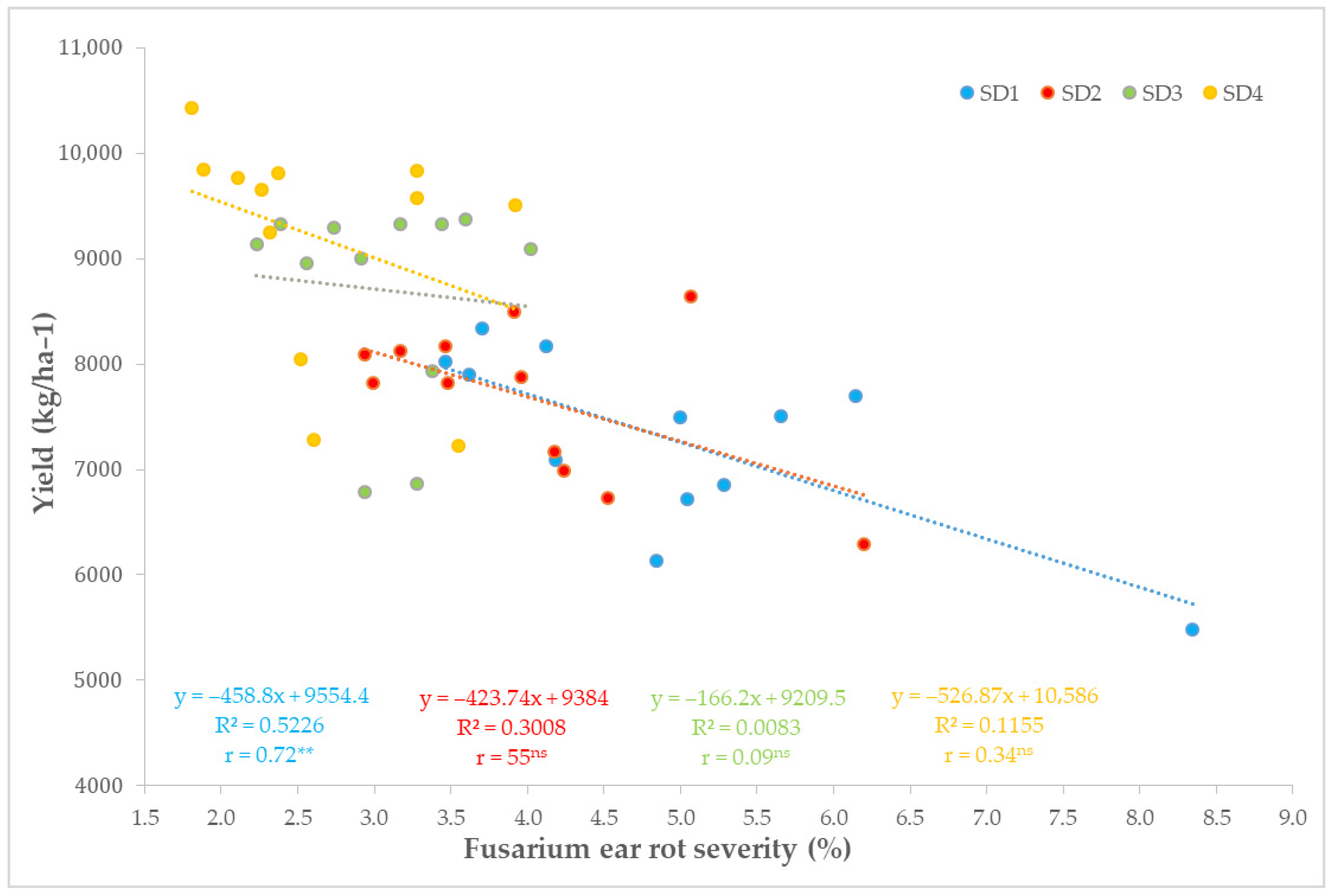 3.1. Incidence and Severity of Fusarium Ear Rot