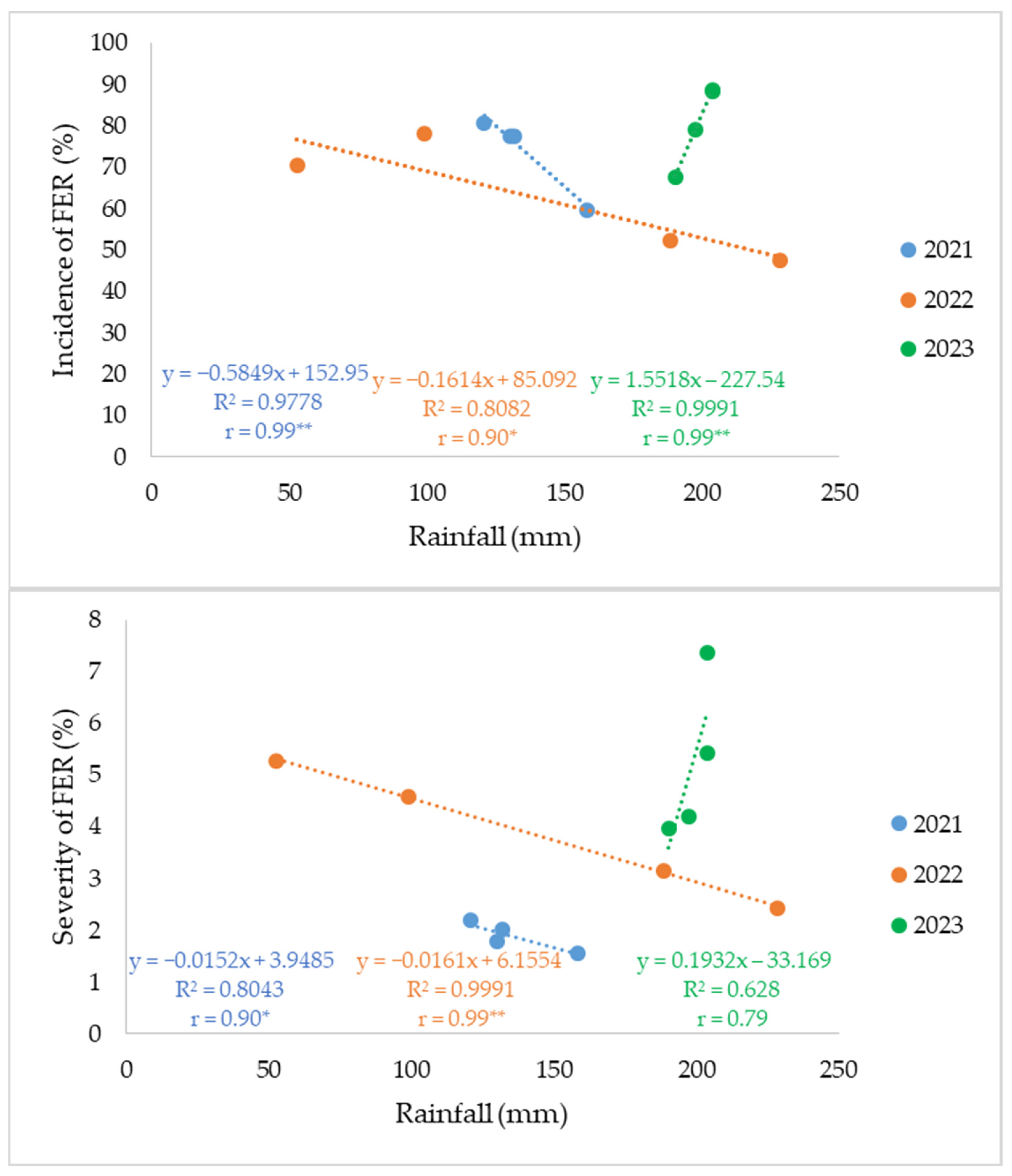 | Disease incidence (%) | 0.93 * | — | 0.86 * | −0.88 * |