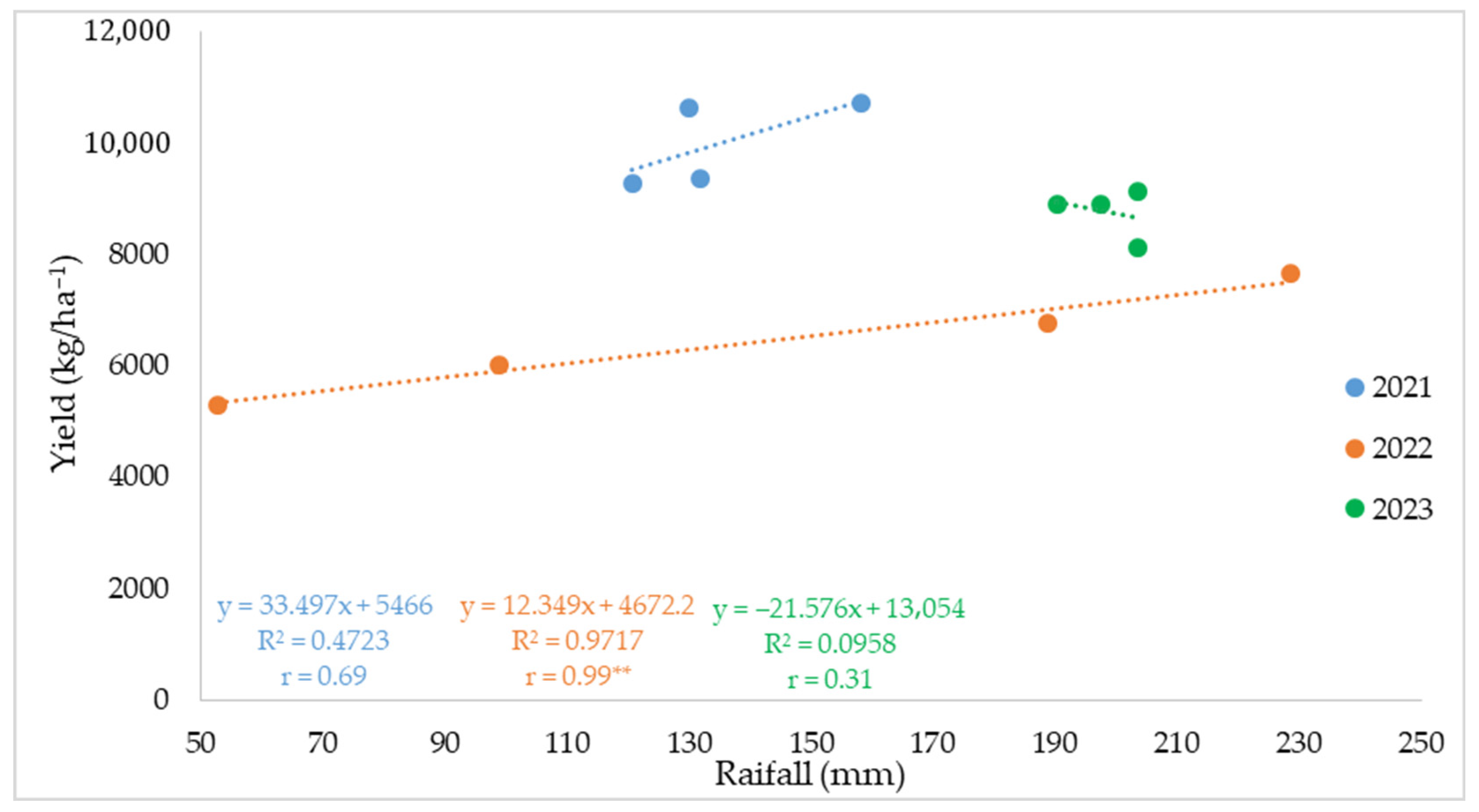 | Yield (kg/ha−1/ha) | 0.99 ** | −0.88 * | −0.99 ** | — |