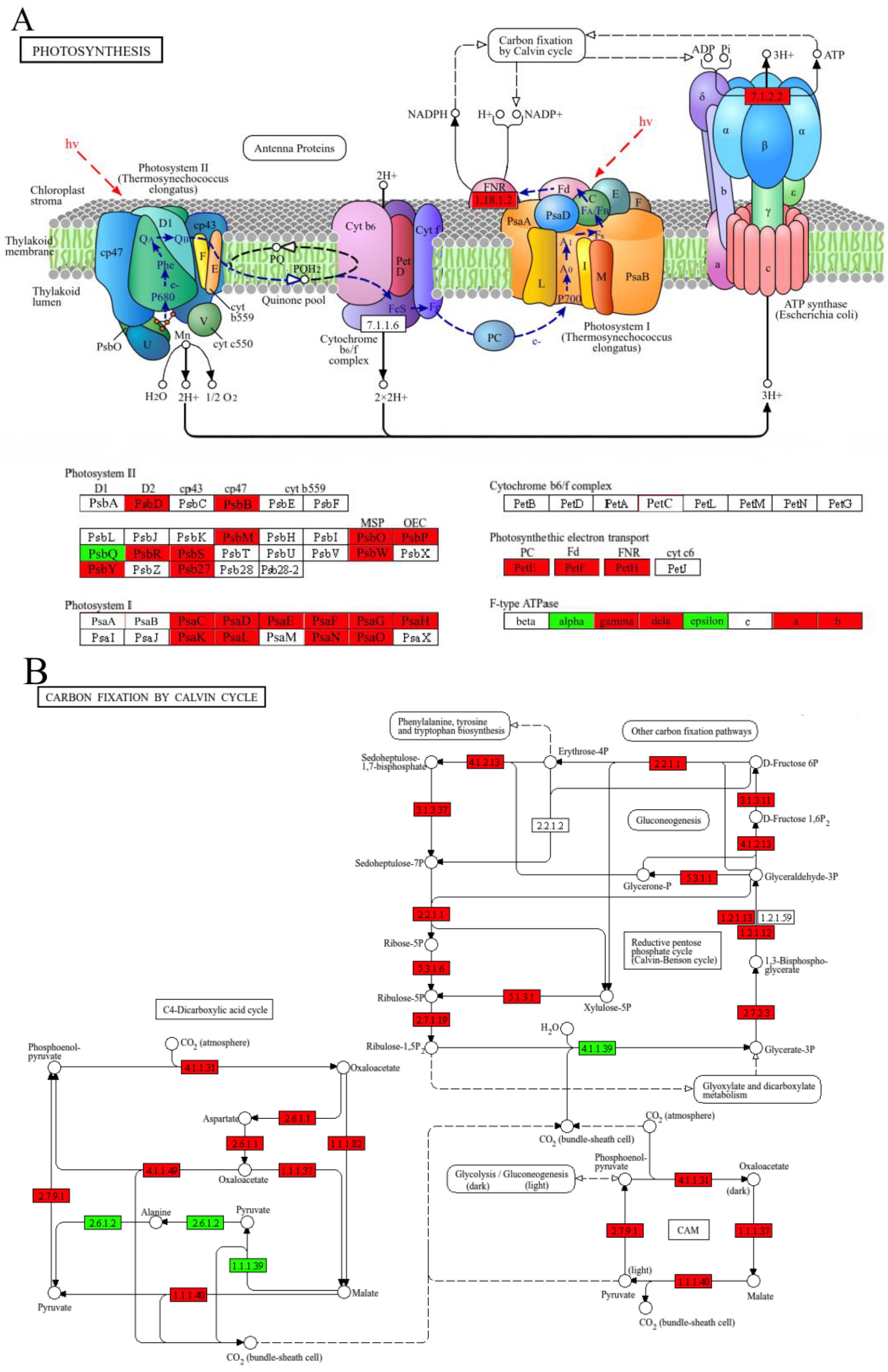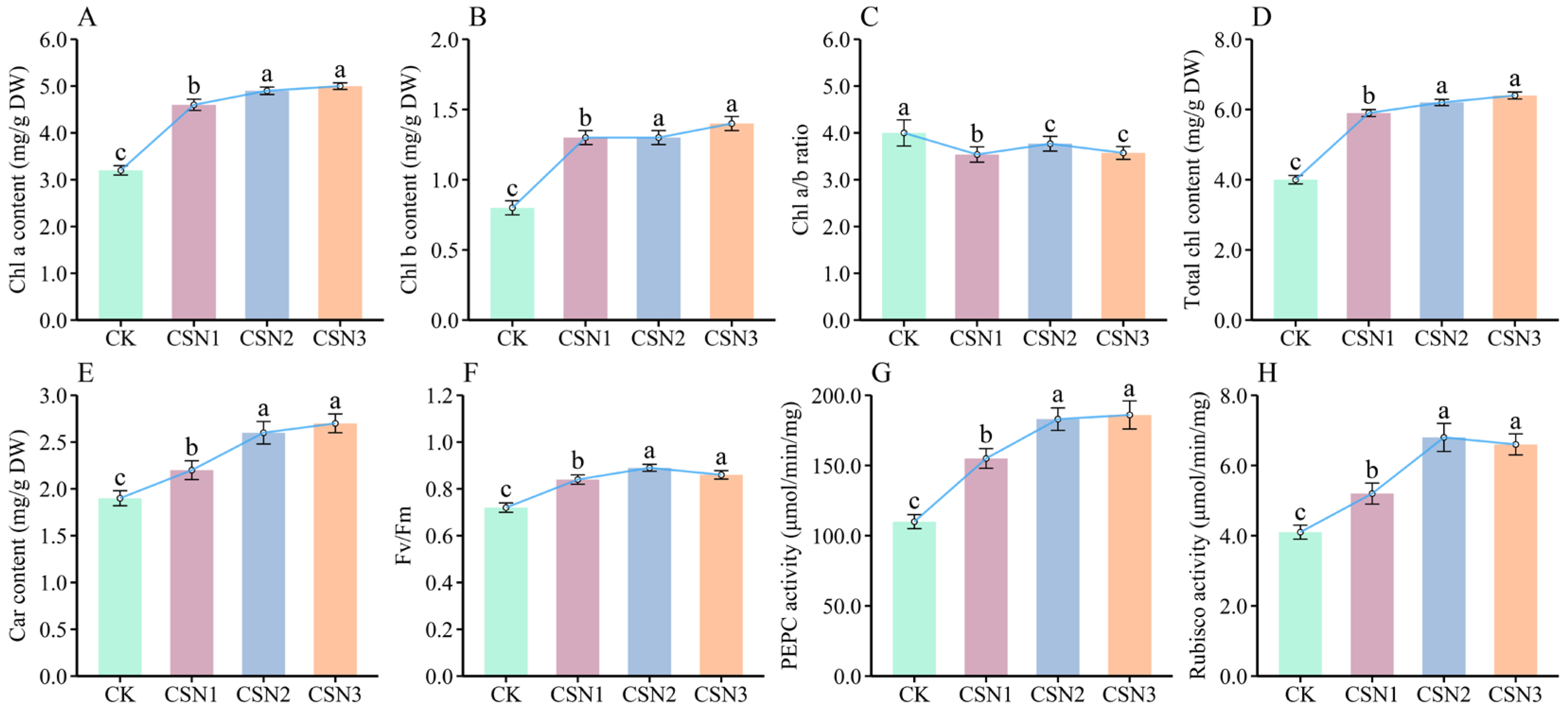 2.4. Determination of Photosynthetic Pigments, Fv/Fm, and Key Carbon Fixation Enzyme Activities