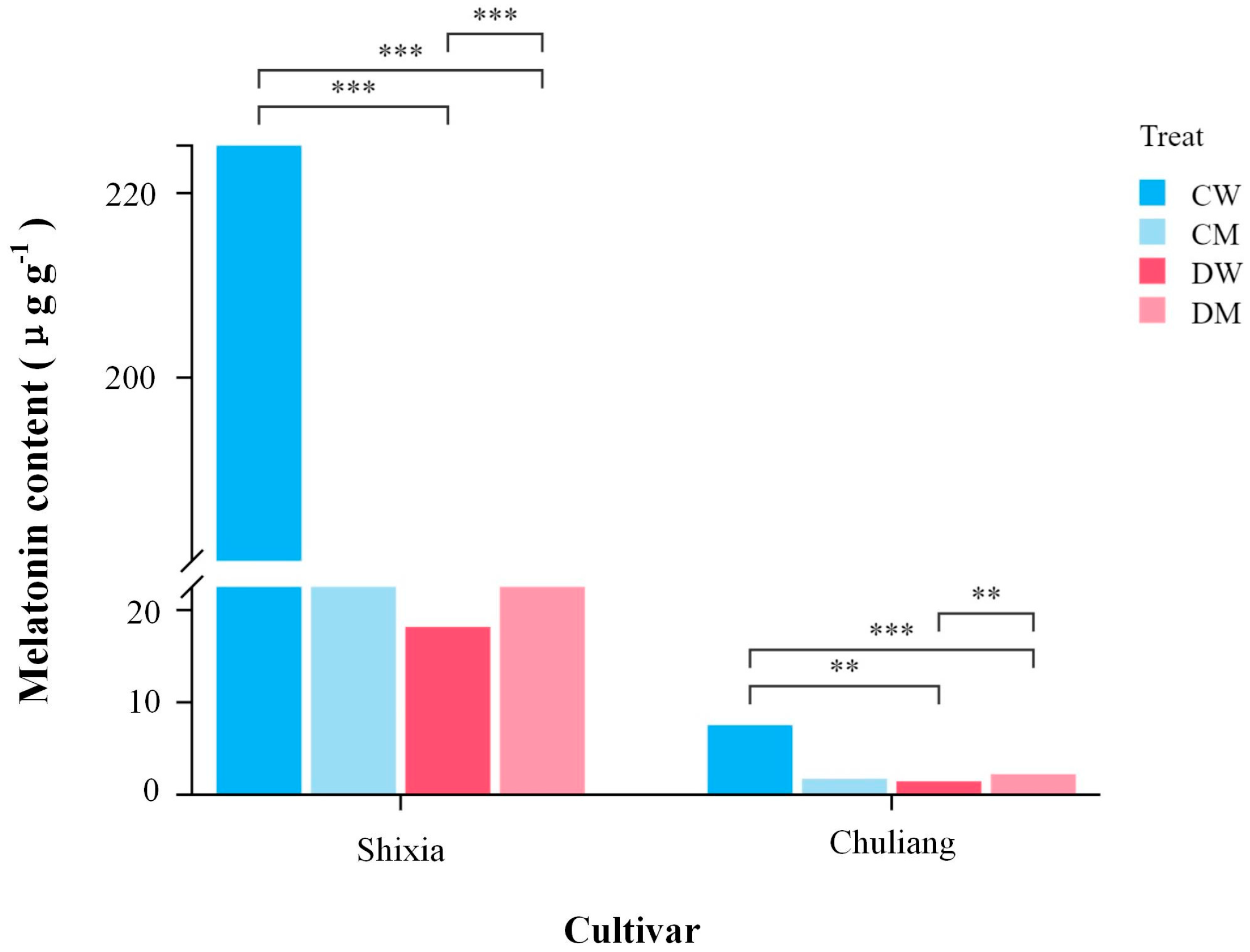 3.1. Efffects of Exogenous MT on Endogenous MT Content of Longan Cultivars Under Drought Stress