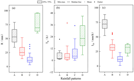 Statistical features of (a) rainfall (R), (b) rainfall duration(TR) and (c) the maximum rainfall intensity in 30 min (I30); among the four rainfall patterns. Note: the colors black, red, blue, and green represent rainfall patterns A, B, C, and D, respectively.