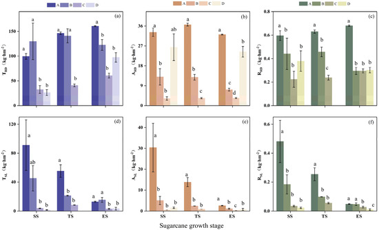 Characteristics of runoff and sediment loss under different rainfall patterns in different sugarcane growth periods. Note: SS, seeding stage; TS, tillering stage; ES, elongation stage; different letters indicate significant differences between different rainfall patterns under the same growth stage at p < 0.05. (a) TRD, the total runoff depth; (b) ARD, the average of runoff depth; (c) RRD, the volume of runoff depth caused by unit rainfall; (d) TSL, the volume of total sediment yield; (e) ASL, the average of sediment yield; (f) RSL, the volume of sediment yield caused by unit rainfall.