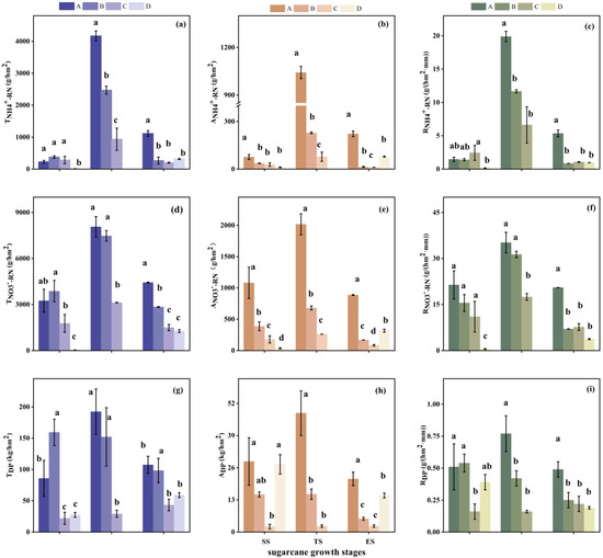 As presented in Figure 5a, TNH4+–RN under patterns A, B, C, and D accounted for 52.6%, 30.7%, 13.6%, and 3.2% of total NH4+–N loss. Additionally, TNH4+–RN, ANH4+–RN, and RNH4+–RN under pattern A, with 228.4 g/hm2, 76.1 g/hm2, and 19.9 g/(hm2·mm) at the TS for example, were 1.7 to 16.6, 4.6 to 13.4, and 1.7 to 3.0 times greater than those under pattern B, and C, respectively (Figure 4a–c). The results also indicated TNH4+–RN, ANH4+–RN, and RNH4+–RN under all patterns were concentrated in the TS, which were remarkably different with the distributions of runoff (Figure 4a–c). TNO3−–RN induced by pattern A and B, which were 8063.4, and 7475.9 g/hm2, accounted for 43.2% and 40.01% of total NO3−–N loss. ANO3−–RN under pattern A among all sugarcane stages was 2015.9 g/hm2, which was significantly higher than others. RNO3−–RN under different patterns showed a similar trend, but the gaps among different rainfall patterns were much smaller than those in ANO3−–RN (Figure 5f). The results also showed that NO3−–N was the main form of dissolved N loss in runoff, accounting for 78.1% of total. The DP loss in runoff under rainfall pattern A and B, which contributed to 81.4% of the TDP (Figure 4e), and ADP and RDP under pattern A and B at TS were significantly higher than those of patterns C and D (p < 0.05) (Figure 5h,i). According to Figure 5e–i, pattern A at the TS induced the maximum TDP, ADP, and RDP, with values of 385.4 g/hm2, 32.1 g/hm2, and 0.77 g/(hm2·mm), while the minimum values occurred under pattern C or B.