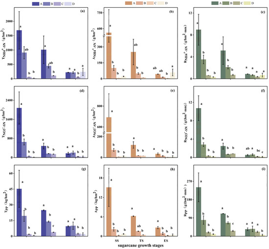 Characteristics of NH4+–N, NO3−–N, and DP loss in runoff under different rainfall patterns at different sugarcane growth periods. Note: SS, seeding stage; TS, tillering stage; ES, elongation stage; different letters indicate significant differences between different rainfall patterns under the same growth stage at p < 0.05. (a) TNH4+−RN, the volume of NH4+–N loss in runoff; (b) ARNH4+–N, the average of NH4+–N loss in runoff; (c) RNH4+–RN, the volume of NH4+–N loss in runoff caused by unit rainfall; (d) TNO3−–RN, the volume of NO3−–N loss in runoff; (e) ANO3−–RN, the average of NO3−–N loss in runoff; (f) RNO3−–RN, the volume of NO3−–N loss in runoff caused by unit rainfall; (g) TDP, the volume of DP loss in runoff; (h) ADP, the average of DP loss in runoff; (i) RDP, the volume of DP loss in runoff caused by unit rainfall.
