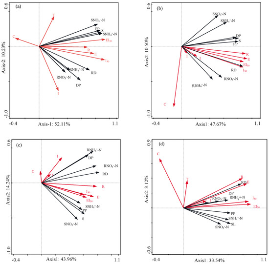 Ordination plot of redundancy analysis (RDA) for RD, SL, and N and P loss constrained by all rainfall parameters and sugarcane coverage under (a) SS, (b) TS, (c) ES, and (d) the entire observation period. Note: abbreviations of affecting factors are as follows: R: rainfall. TR: rainfall duration. I: mean rainfall intensity. I30: the maximum rainfall intensity in 30 min; E: the mean kinetic energy of rainfall; EI30: the rainfall erosivity. C: sugarcane coverage.